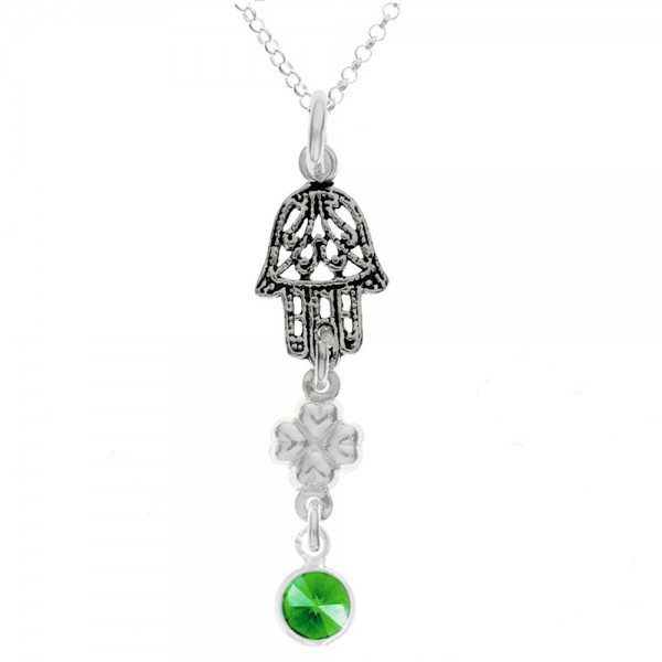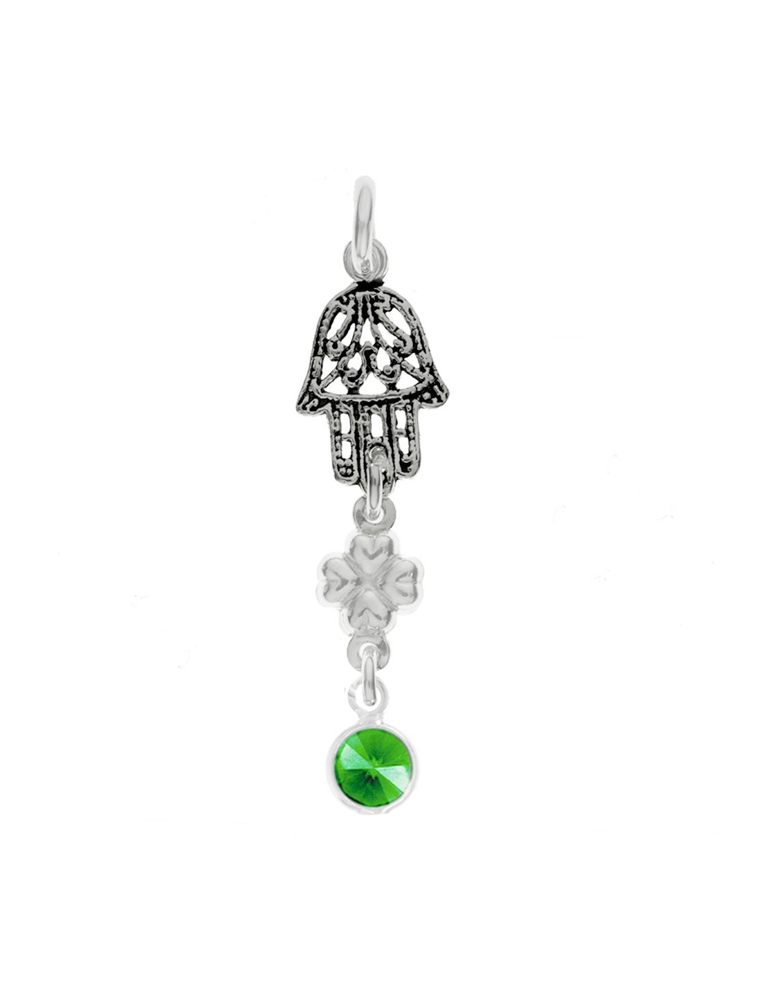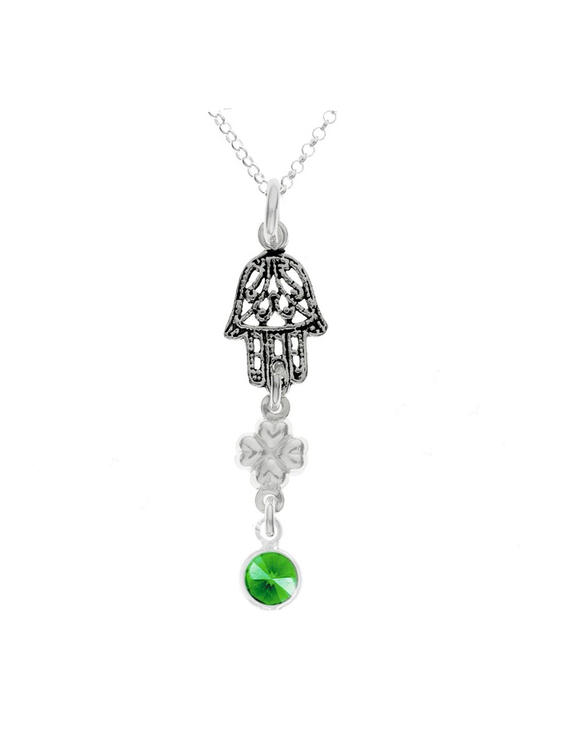 Amuleto doble Mano de Fátima & Trébol de la Suerte con punto de luz de cristal verde fabricado en Plata de Ley.