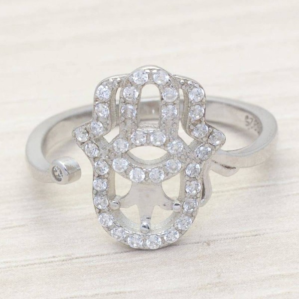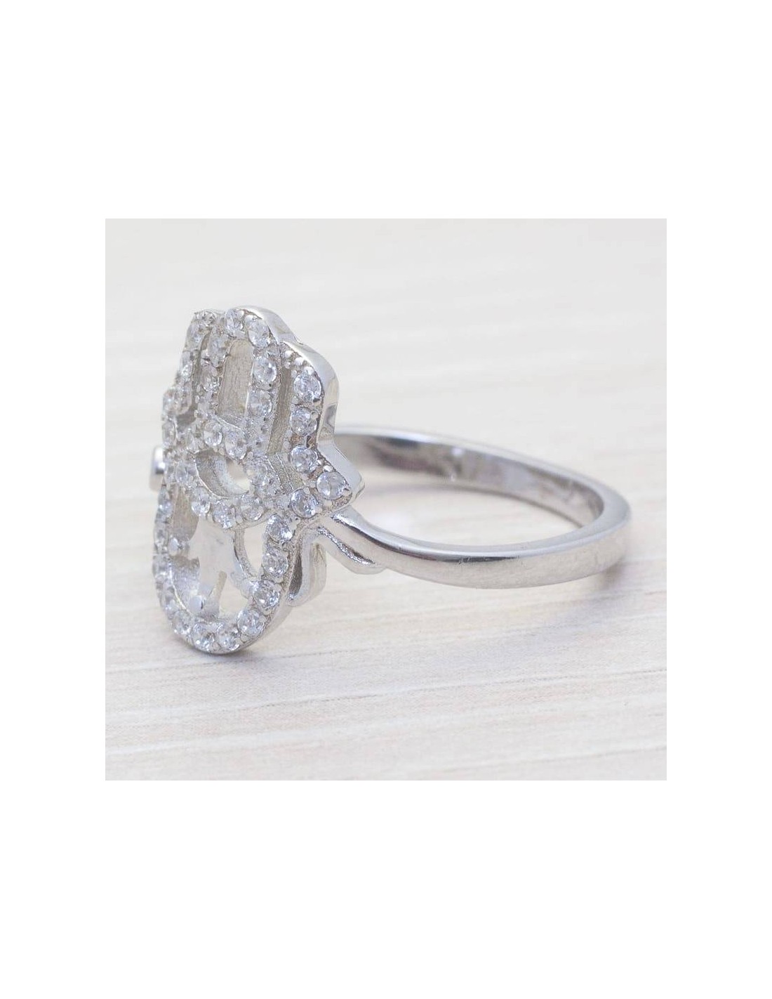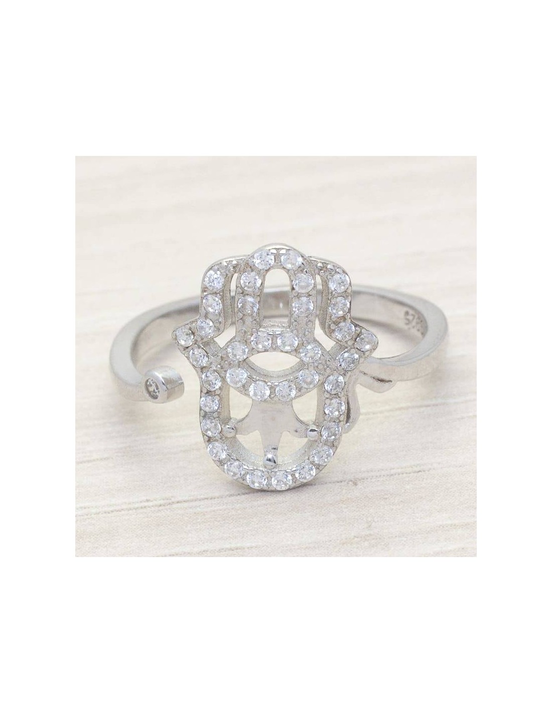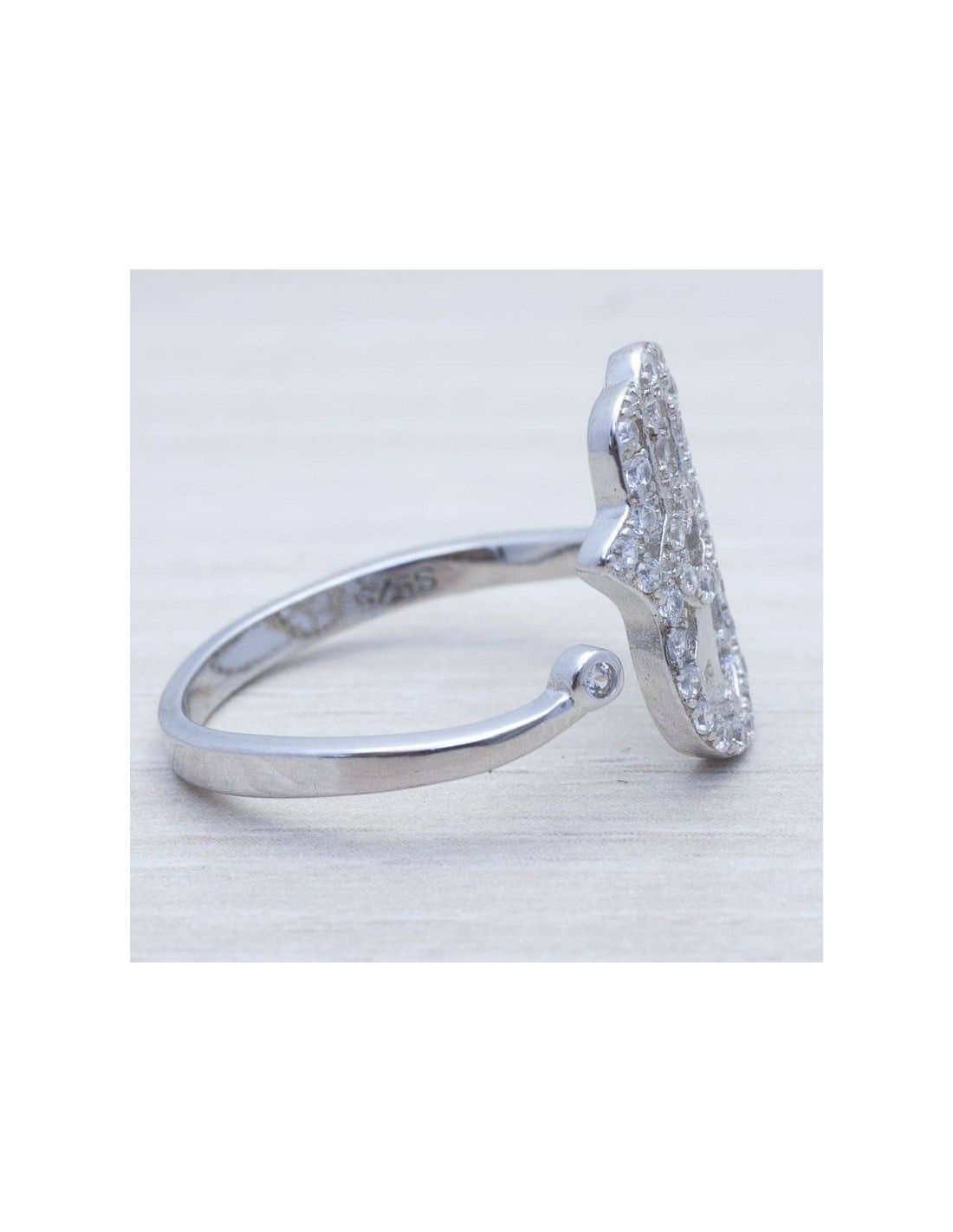 Original anillo fabricado en Plata de Ley 925 con baño de rodio, con circonia y diseño de mano calada. Tamaño ajustable.