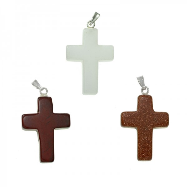 Colgante cruz de piedra con drop de bisutería: disponible en cuarzo, goldstone y jaspe rojo