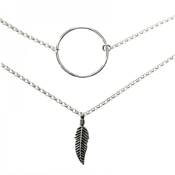 Precioso collar con doble cadena Roló con entrepieza Karma y colgante pluma, fabricado en Plata de Ley 925.