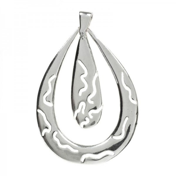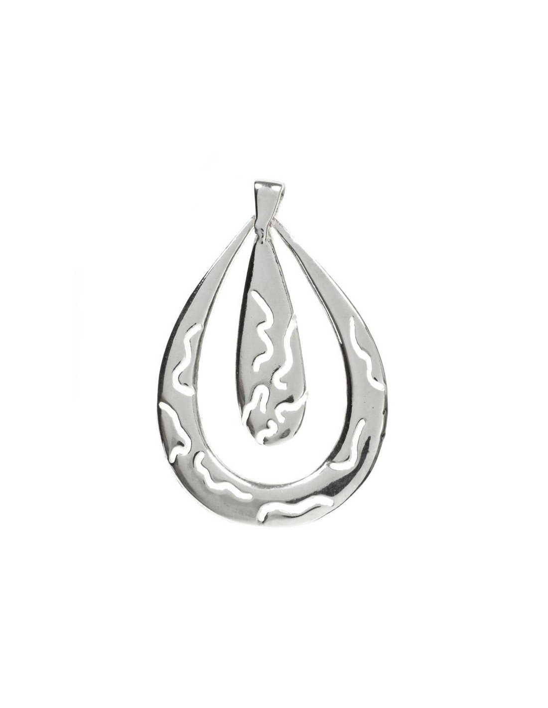 Colgante doble gota con motivos abastractos calados, fabricado en Plata de Ley 925 con acabado liso.