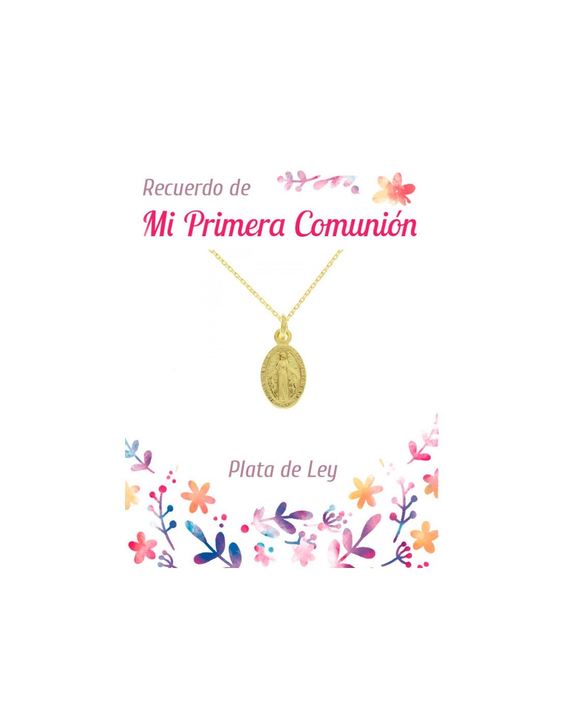 Colgante dorado Virgen Milagrosa Primera Comunión de Plata de Ley bañada en Oro.