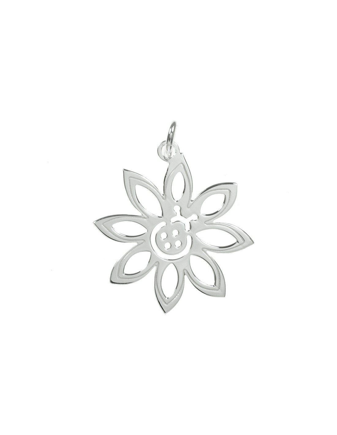 Colgante flor con pétalos puntiagudos y mariquita calada fabricado en Plata de Ley