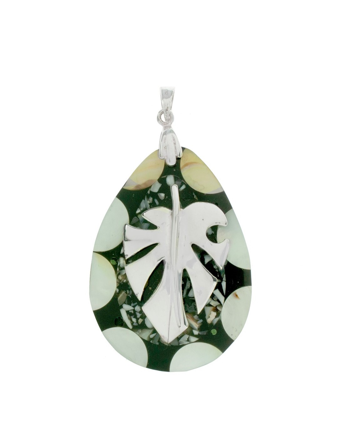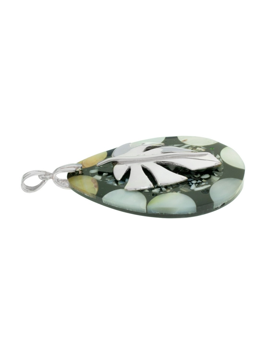 Colgante gota con hoja Monstera fabricado con resina, nácar y Plata de Ley 925.