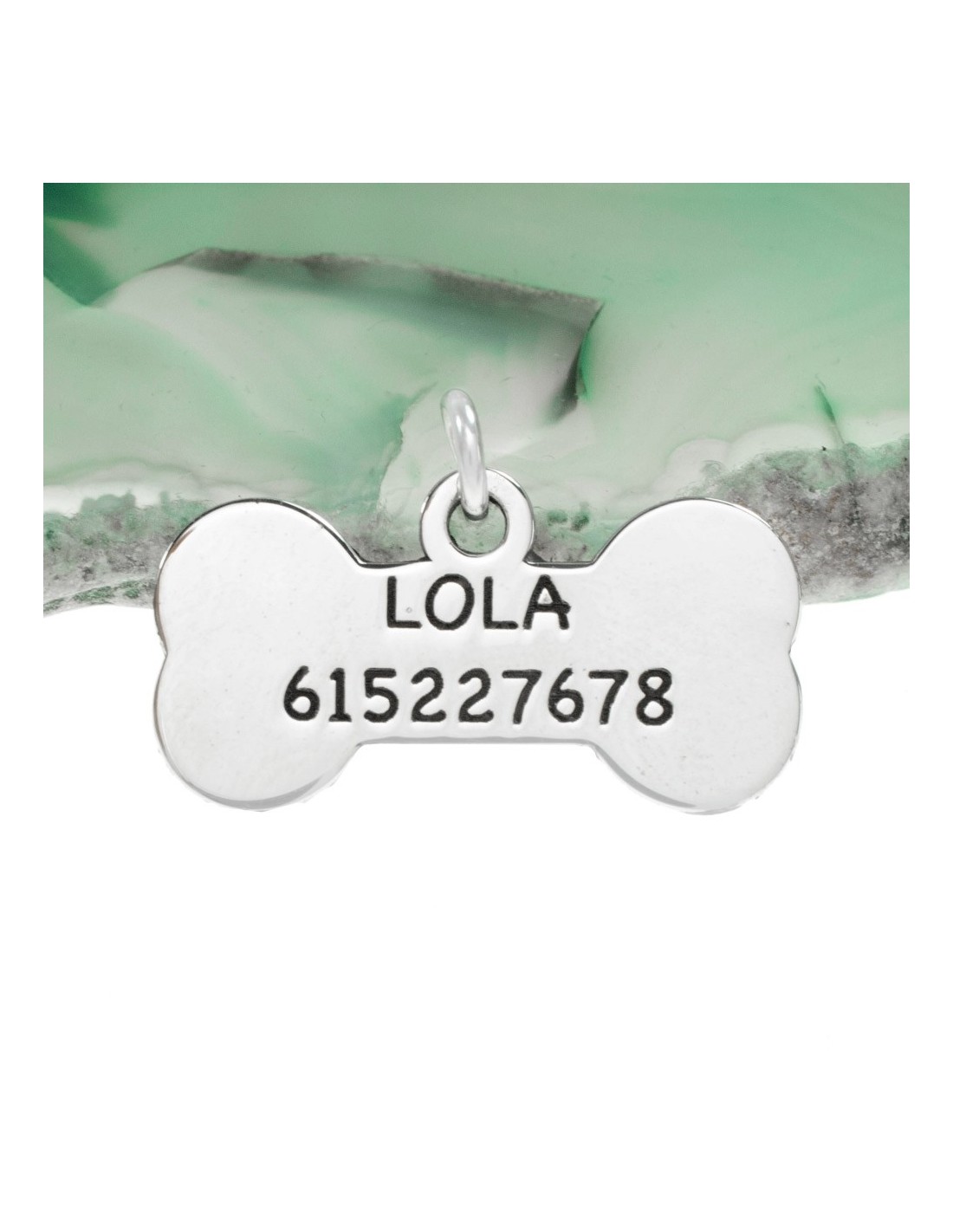 Colgante hueso para perro nombre y contacto personalizado fabricado en Plata de Ley