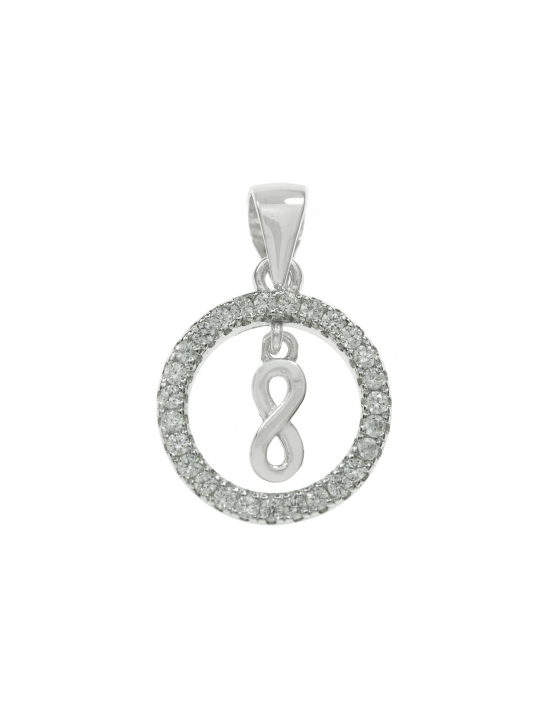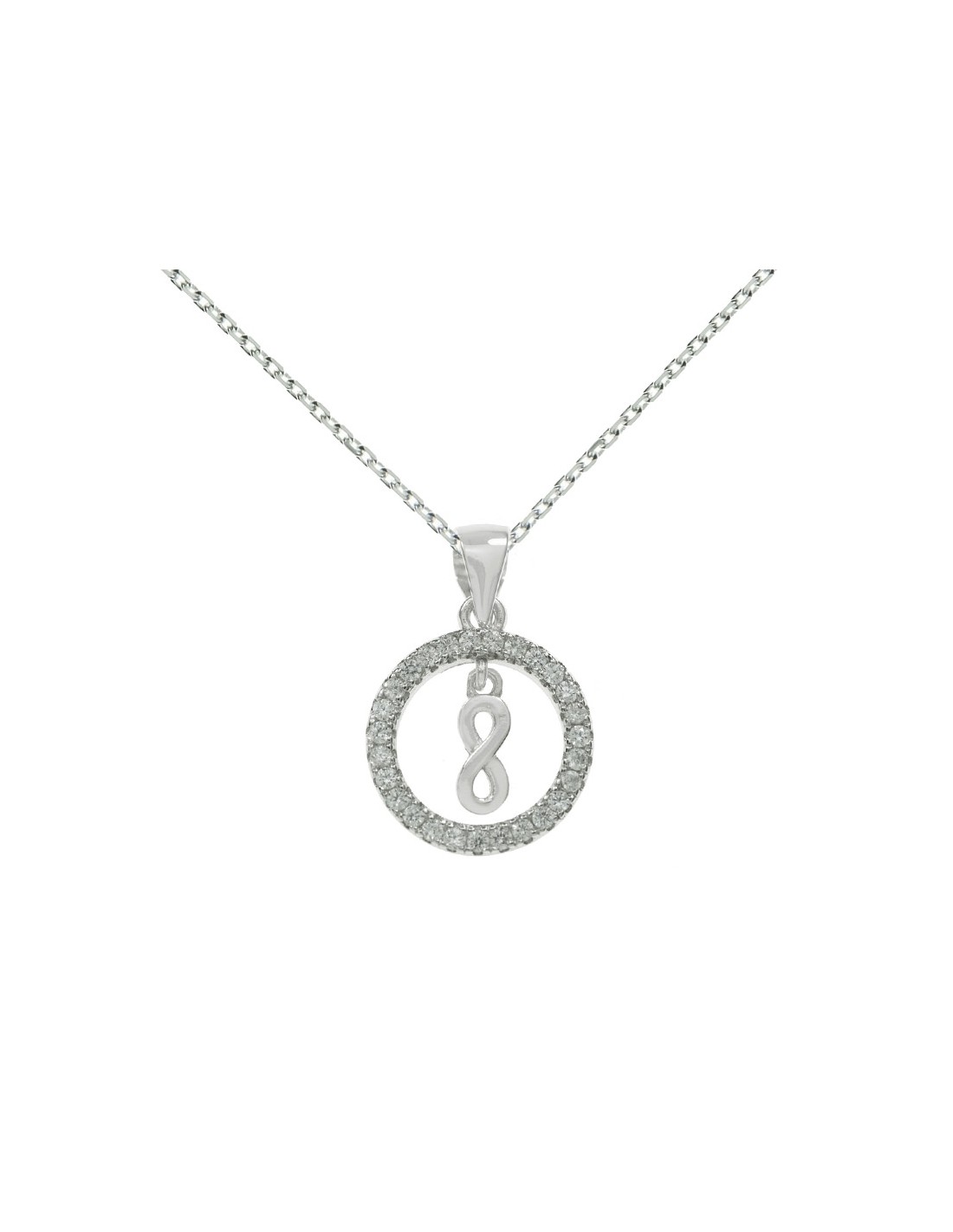 Colgante diseño Karna tupido con circonitas blancas y colgante símbolo infinito, fabricado en Plata de Ley 925 con acabado rodiado