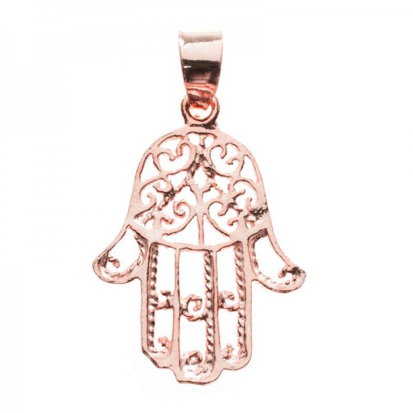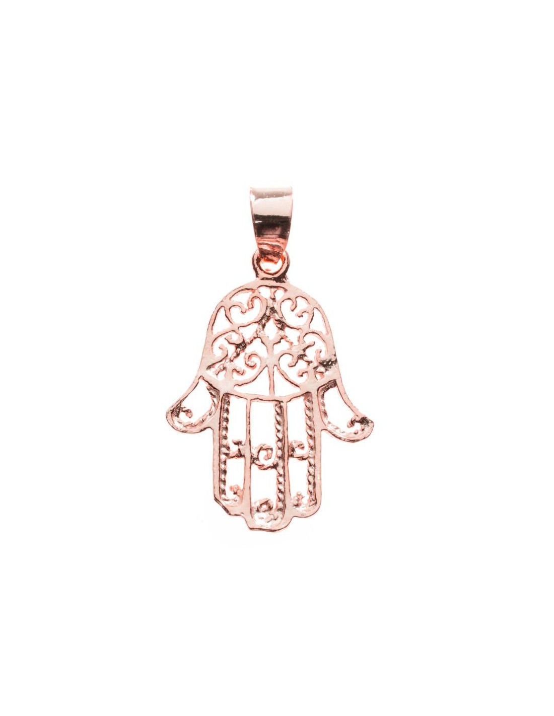Colgante amuleto con diseño de mano de Fátima con espirales, fabricado en Plata de Ley 925 con acabado liso.
