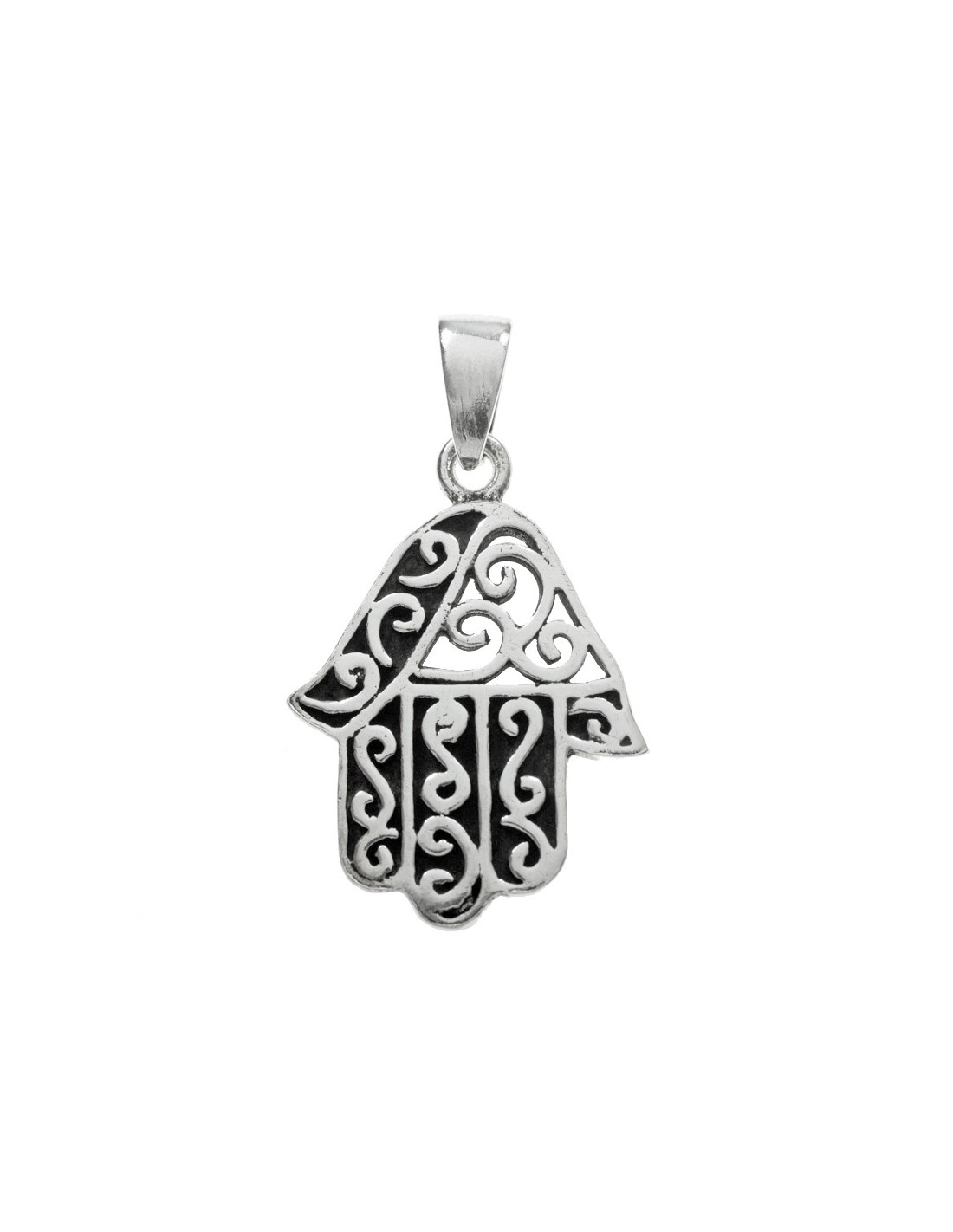 Colgante mano de Fátima con espirales fabricada en Plata de Ley