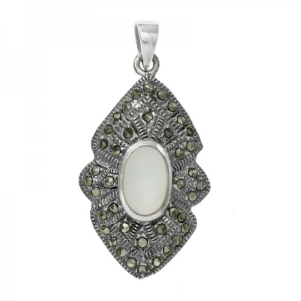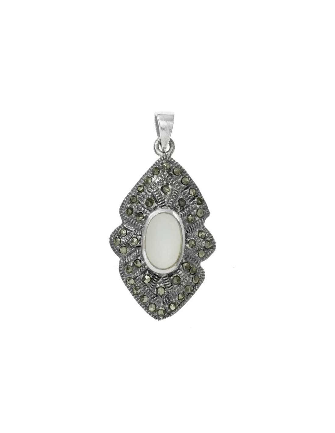 Colgante de estilo vintage con óvalo de nácar en el centro, fabricado en Plata de Ley 925 con acabado de plata vieja y marquesitas.