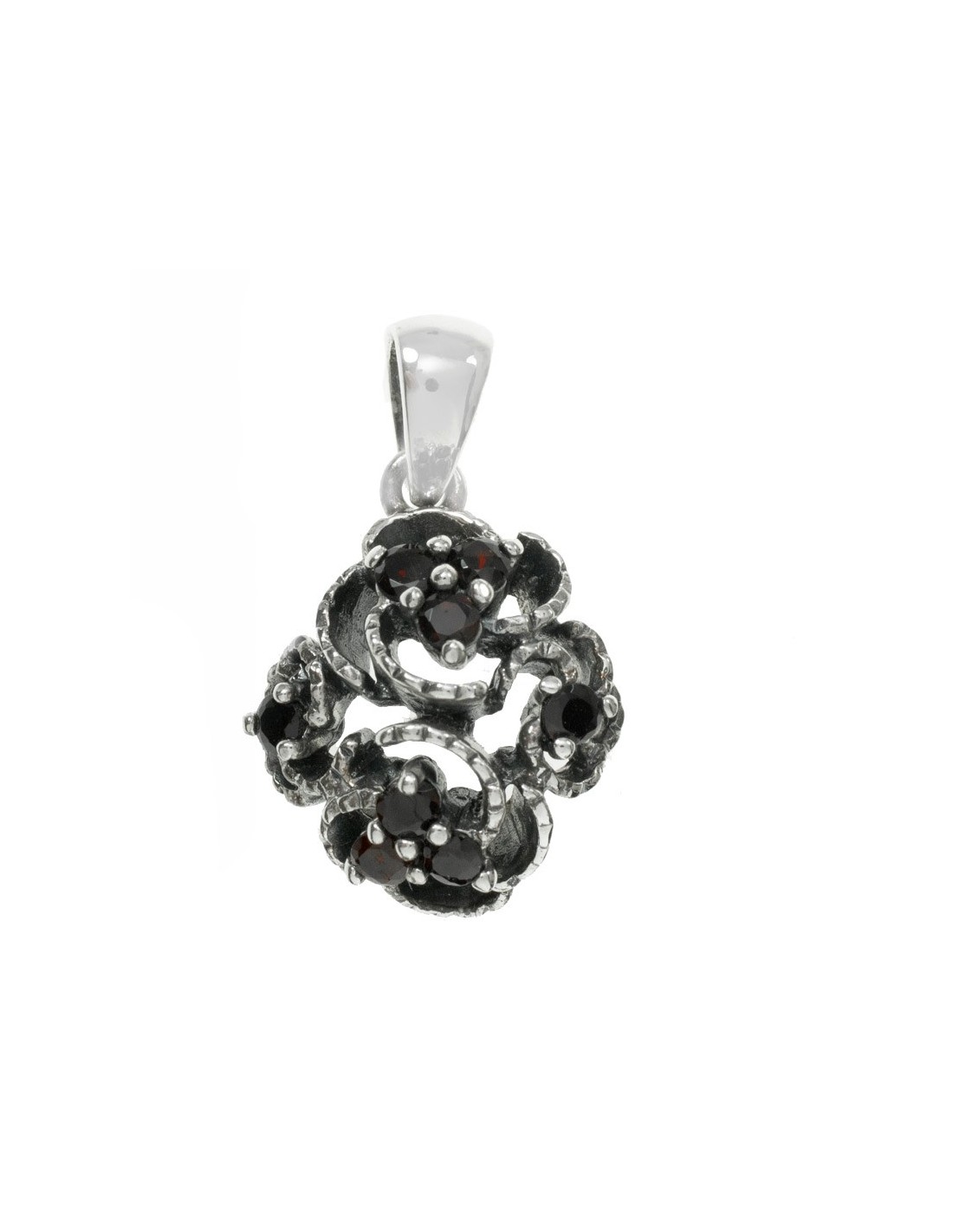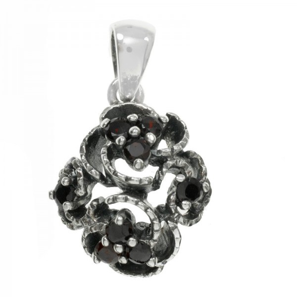 Colgante de estilo vintage con diseño ondulado con piedras granates engarzadas, fabricado en Plata de Ley 925 con acabado de plata vieja.