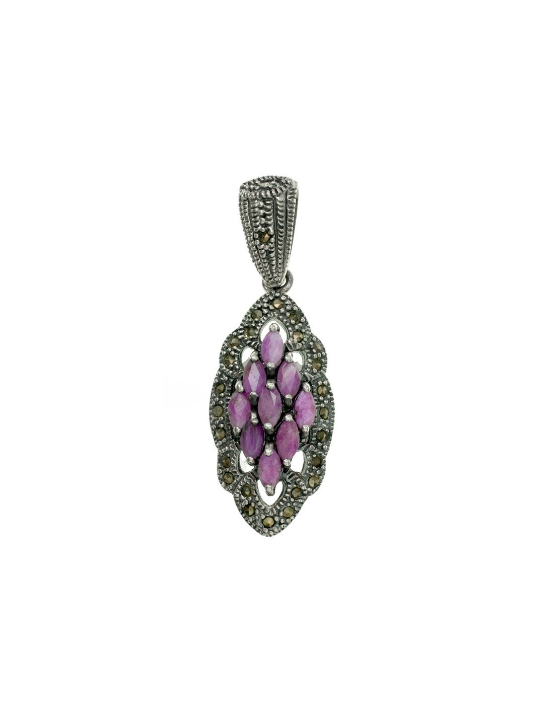 Colgante de estilo vintage con diseño de rombo con rubiés engarzados, fabricado en Plata de Ley 925 con acabado de plata vieja y marquesitas.