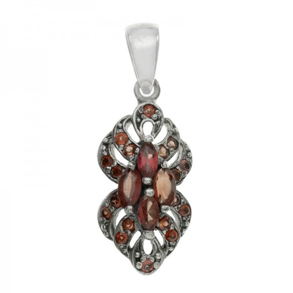 Colgante de estilo vintage con diseño simétrico y granates engarzados fabricado en Plata de Ley 925 con acabado de plata vieja.