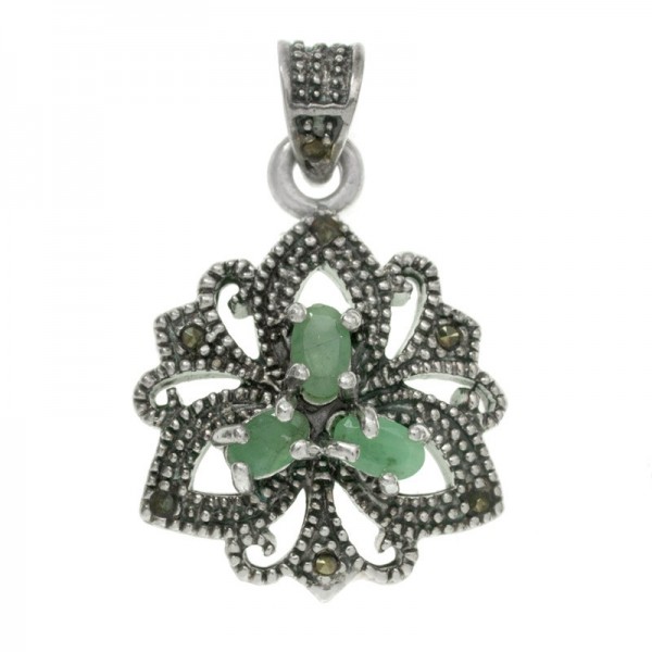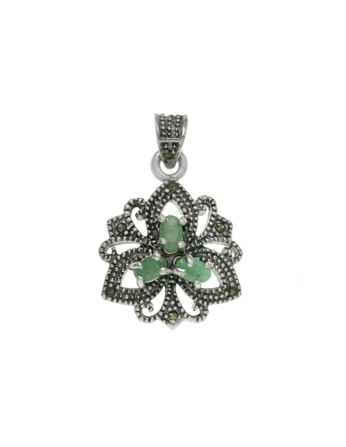 Colgante de estilo vintage con diseño de triple pétalo y tres esmeraldas en el centro, fabricado en Plata de Ley 925 con acabado envejecido y marquesitas.