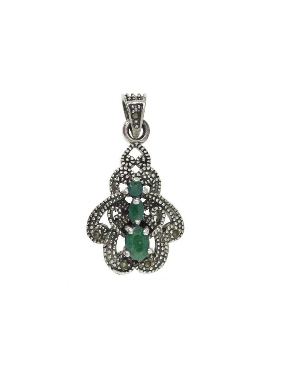 Colgante de estilo vintage con triple esmeralda o rubí, fabricado en Plata de Ley 925 con acabado de plata vieja y marquesitas.