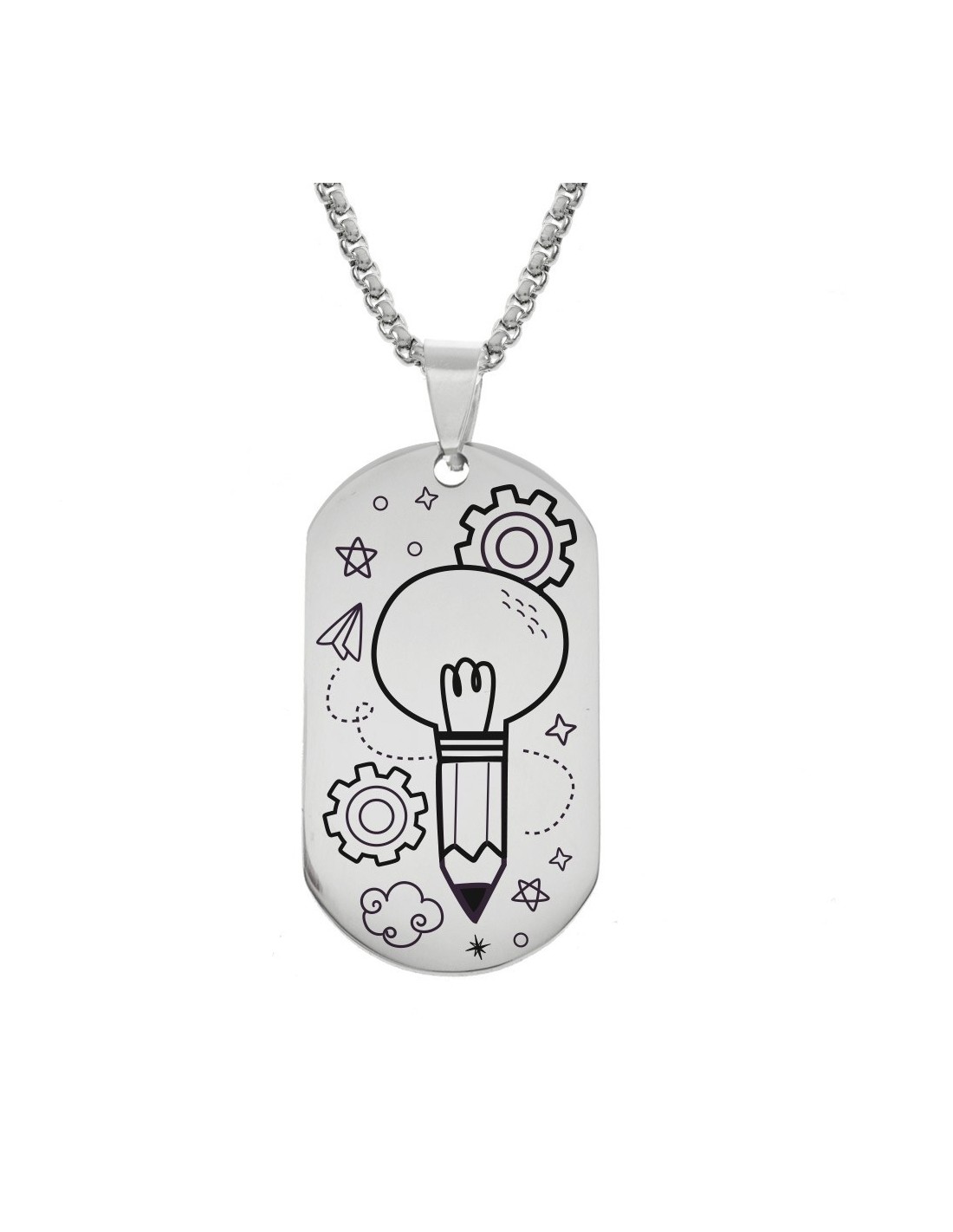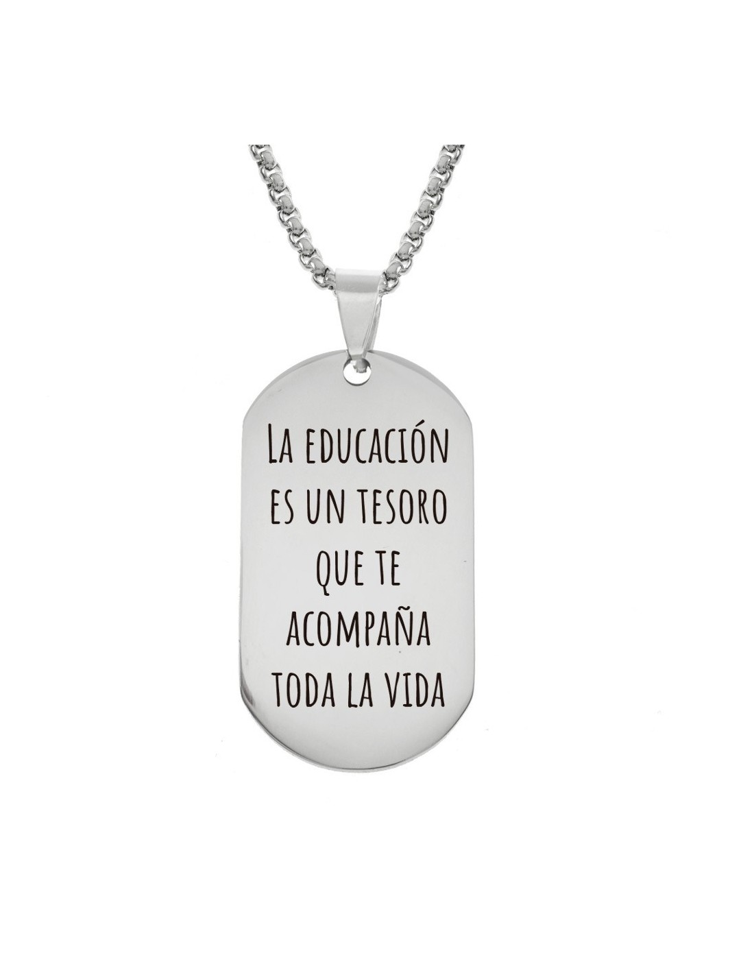 Collar chapa tipo militar con mensaje grabado láser a doble cara con mensaje "La educación es un tesoro que te acompaña toda la vida" fabricado en acero inoxidable.