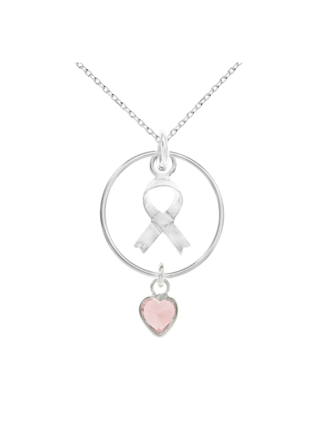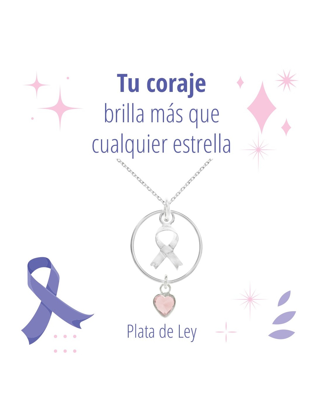 Collar con lazo y corazón de cristal rosa rosa lucha contra el cáncer fabricado en Plata de Ley