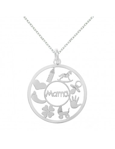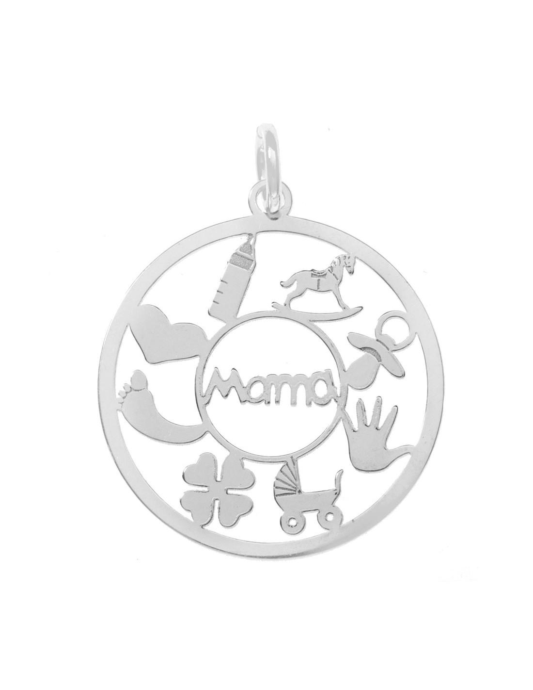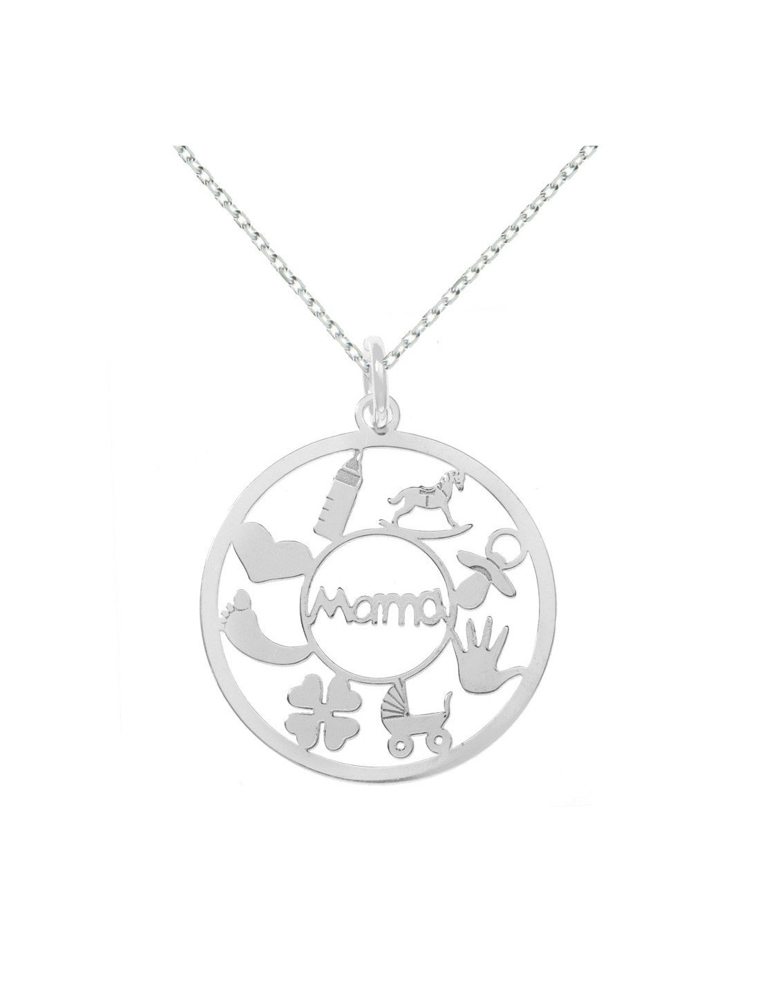 Colgante mamá calado con símbolos de la maternidad fabricado en Plata de 1ª Ley 925. Incluye cadena de 40 cm + 5 cm alargue.
