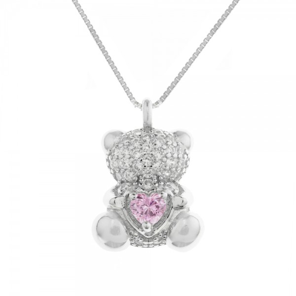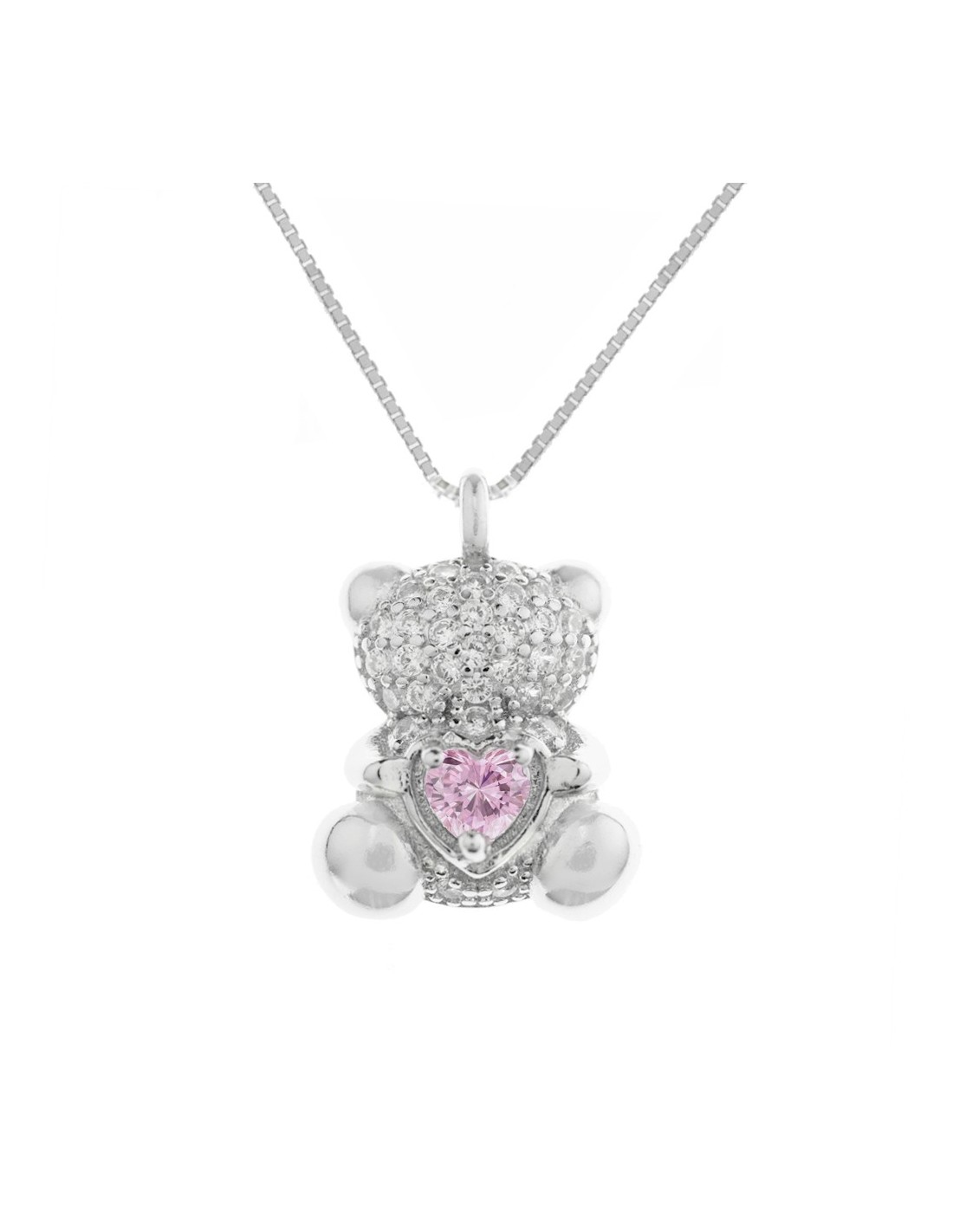 Collar osito de circonitas blancas y con corazón de circonita rosa fabricado en Plata de Ley