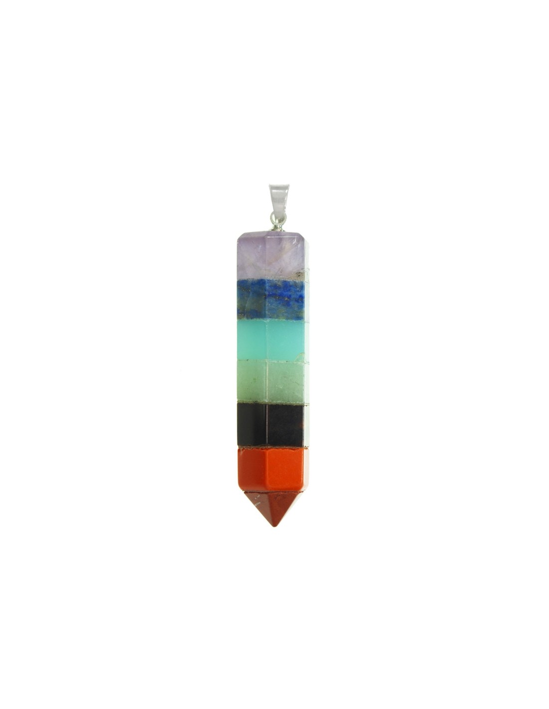 Collar prisma hexagonal 7 chakras: amatista, lapislázuli, calcedonia azul, turquesa, ojo de tigre, cornalina y jaspe rojo. Drop de acero.