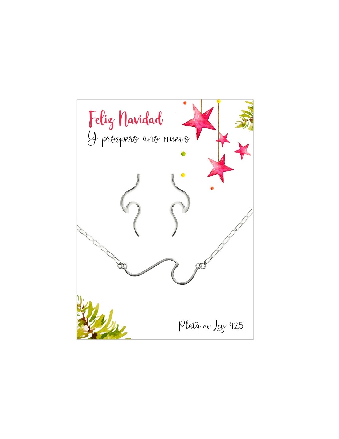Conjunto de collar y pendientes diseño ola minimalista fabricado en Plata de Ley 925, con bonita tarjeta navideña para regalar.