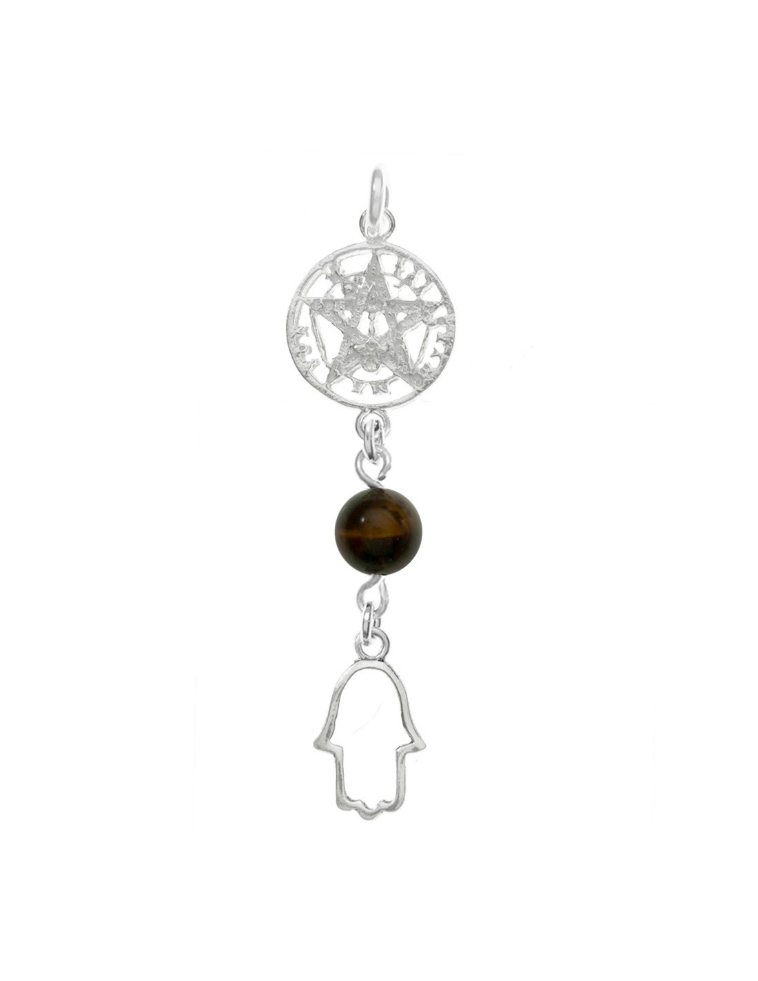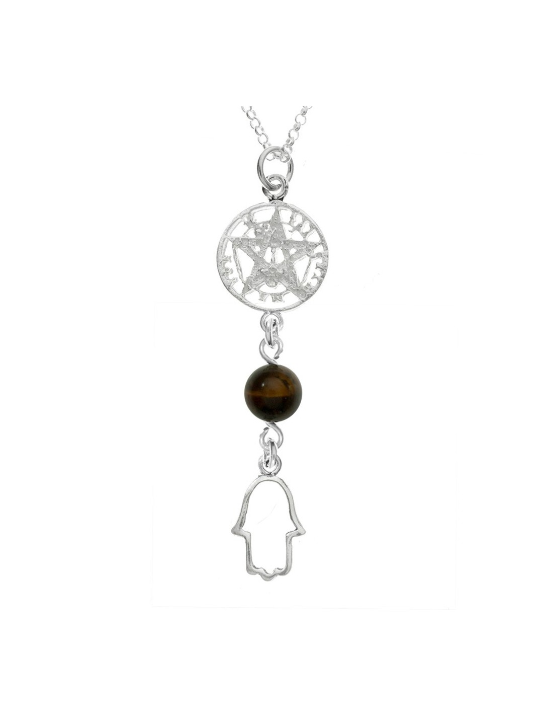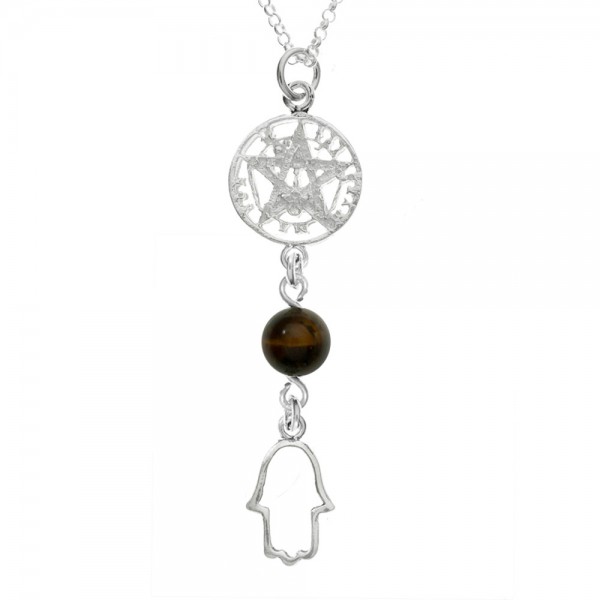 Collar con doble amuleto Tetragrámaton & Mano de Fátima con piedra ojo de tigre en el centro fabricado en Plata de Ley.