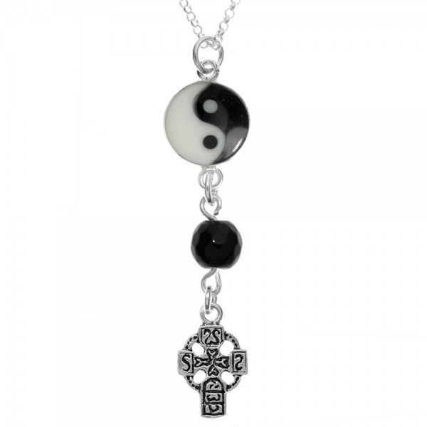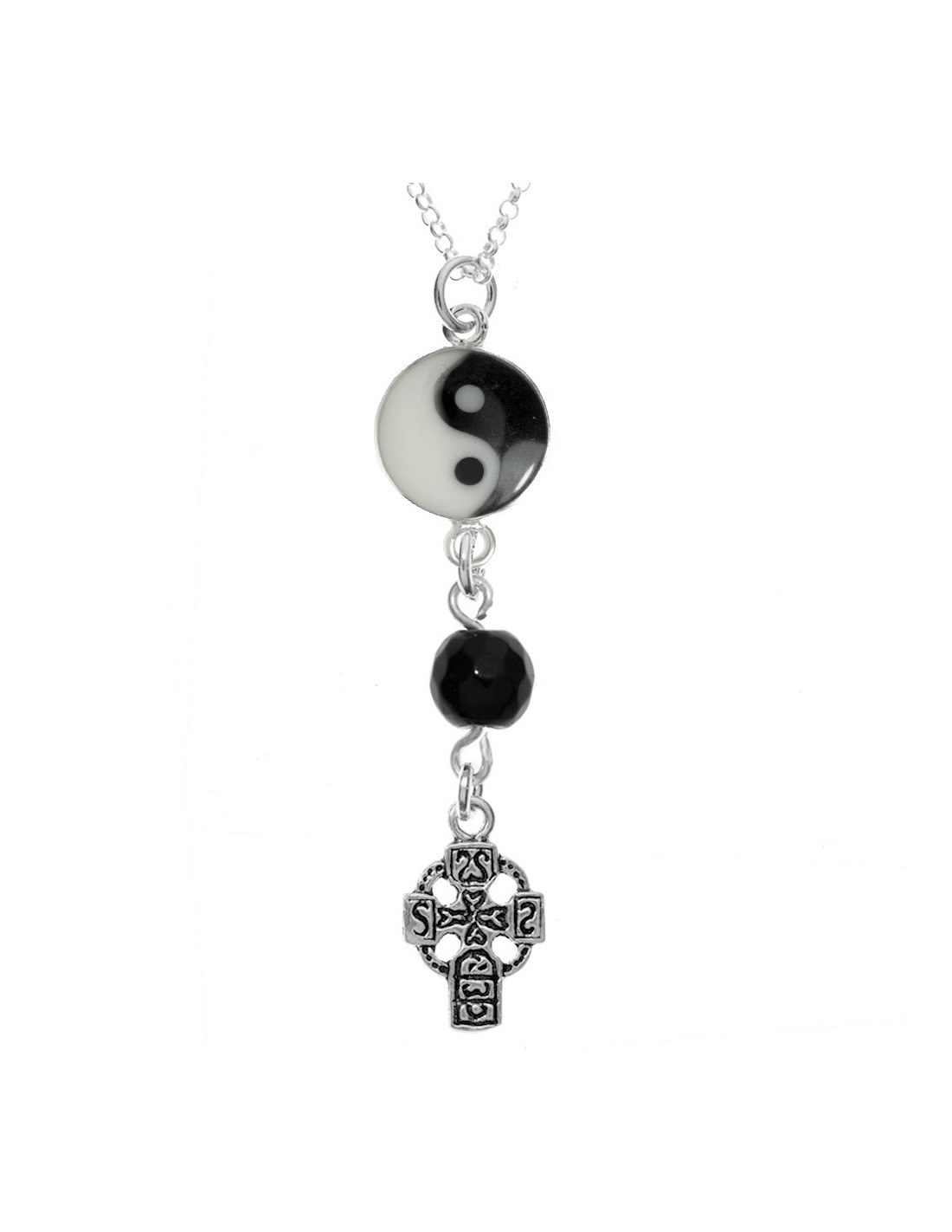 Collar con doble amuleto Yin-Yang & cruz celta con piedra ónix facetado en el centro fabricado en Plata de Ley.