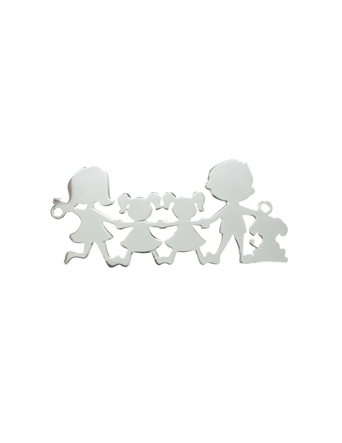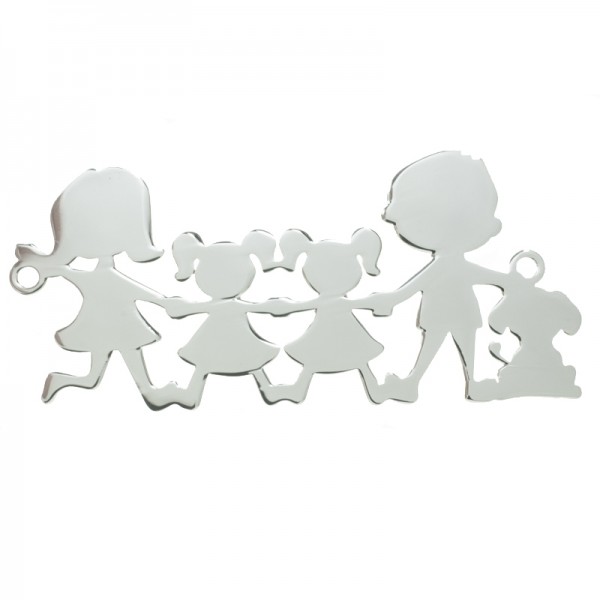 Entrepieza la familia Plata de Ley 925 con padre, madre, dos niñas y perro.