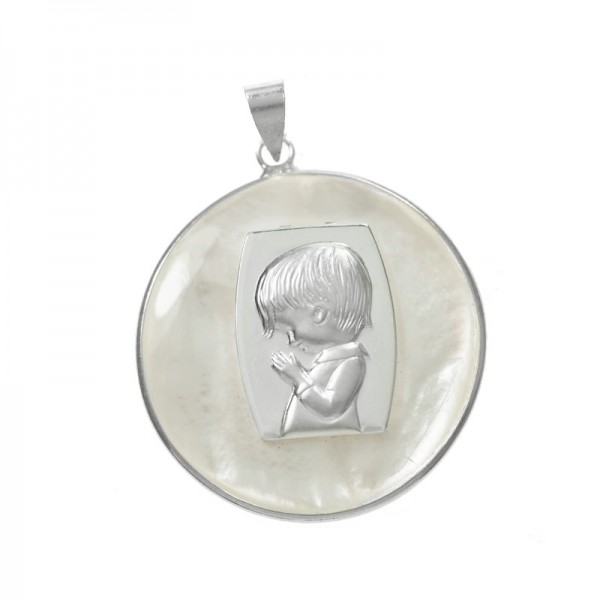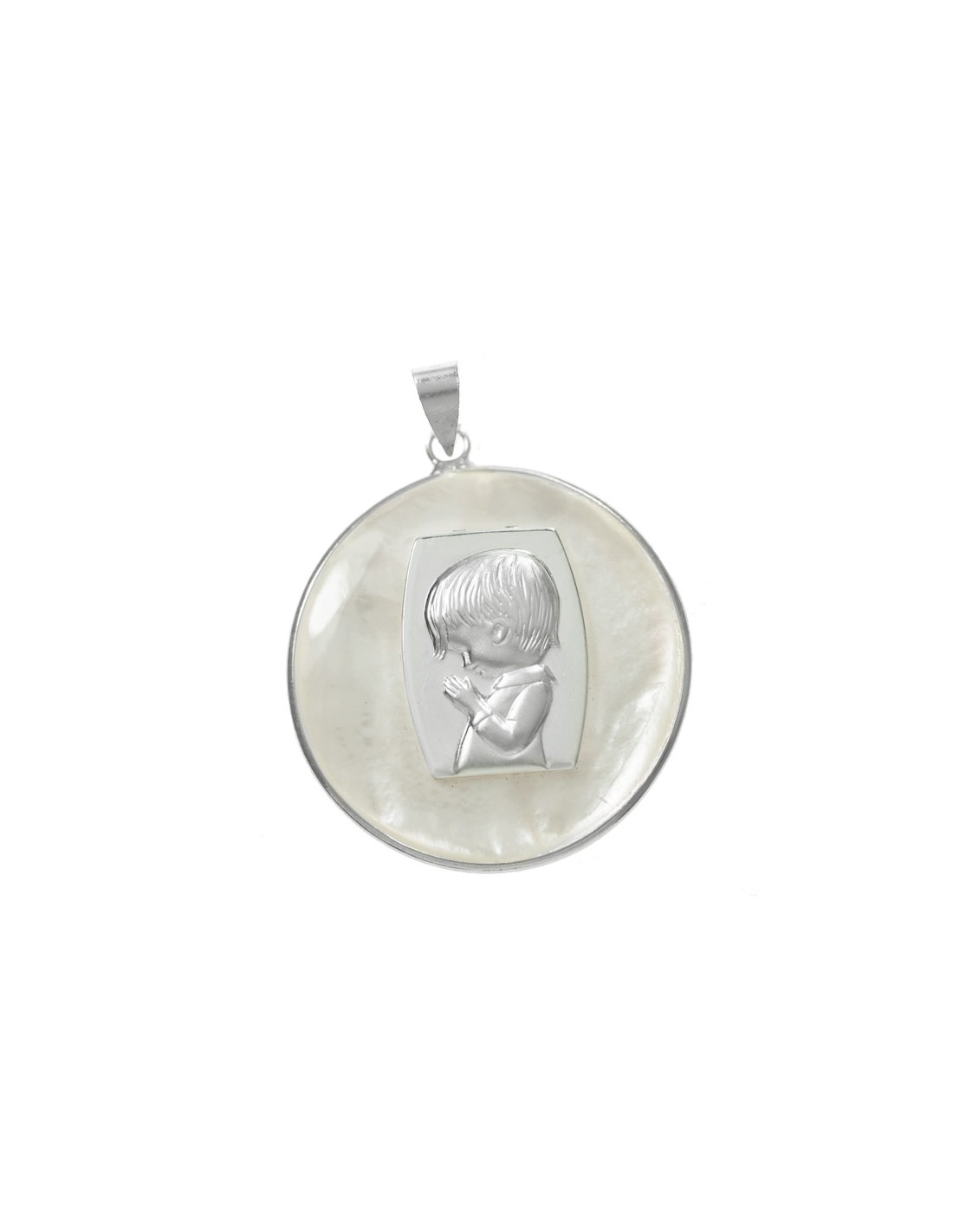 Medalla niño con fondo de nácar blanco fabricado en Plata de Ley 925 con acabado liso.
