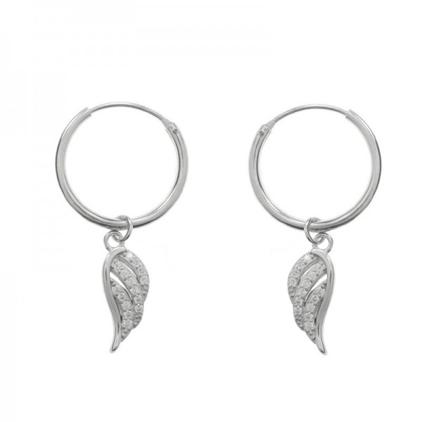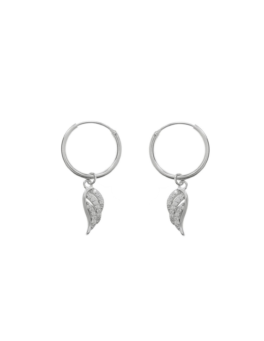 Pendientes aro con ala colgante con detalles de circonitas blancas fabricados Plata de Ley 925 con baño de rodio.