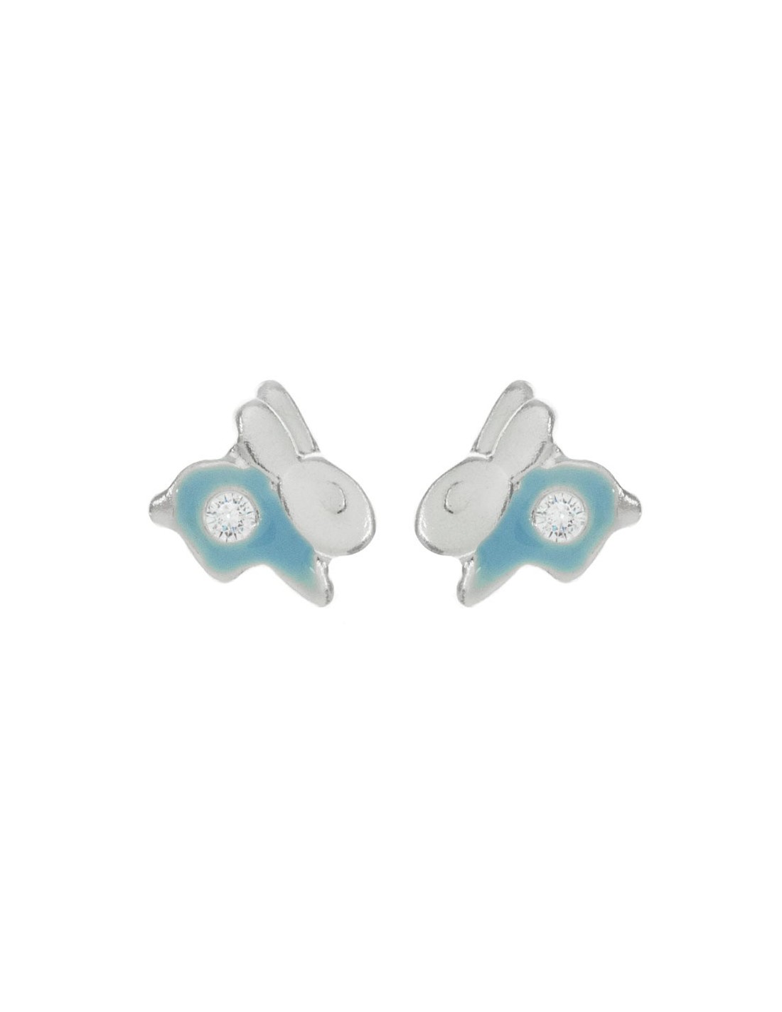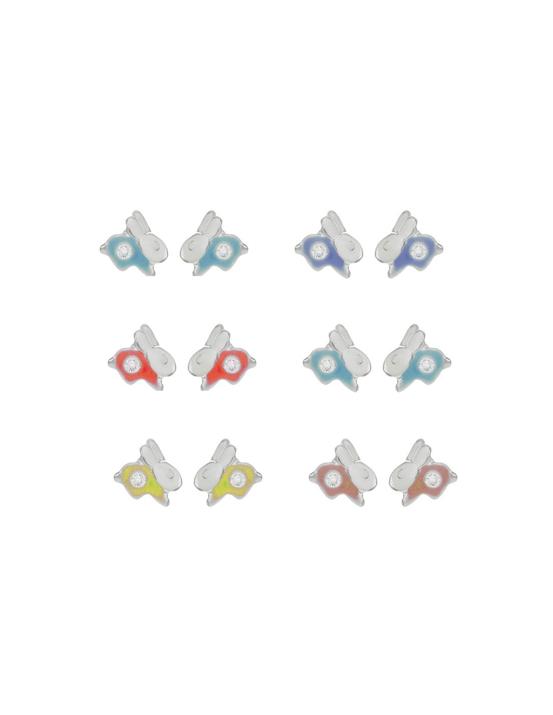 Pendientes diseño conejito con cierre rosca fabricados en Plata de Ley con detalle esmaltado y circonita blanca. Incluye 6 colores surtidos.