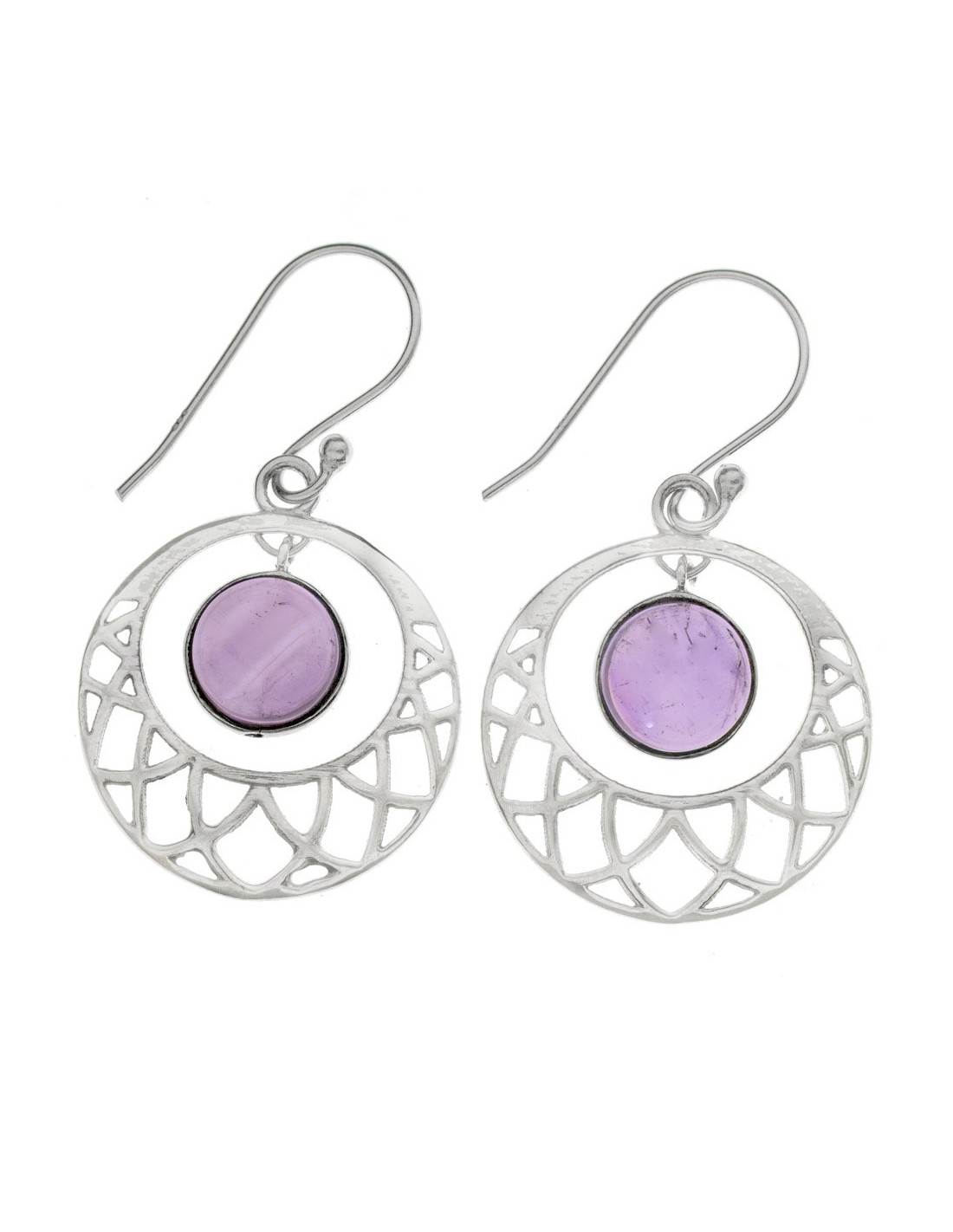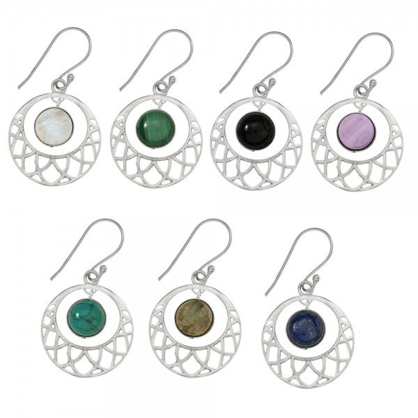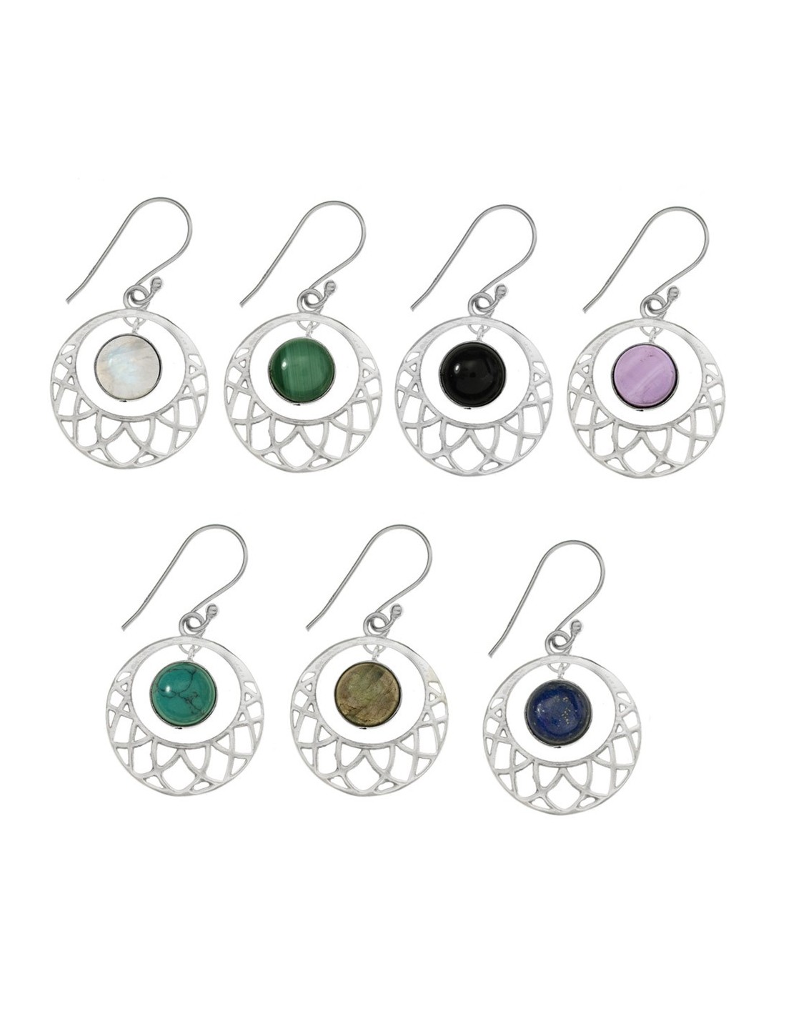 Pendientes étnicos con piedra redonda y diseño mandala fabricados en Plata de Ley Disponible en piedra de luna, ónix, turquesa, labradorita, amatista, malaquita y lapislázuli.