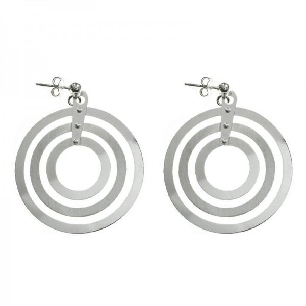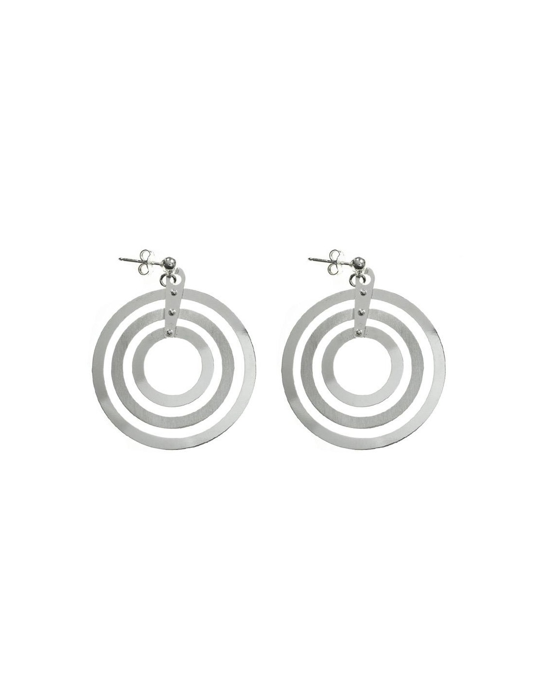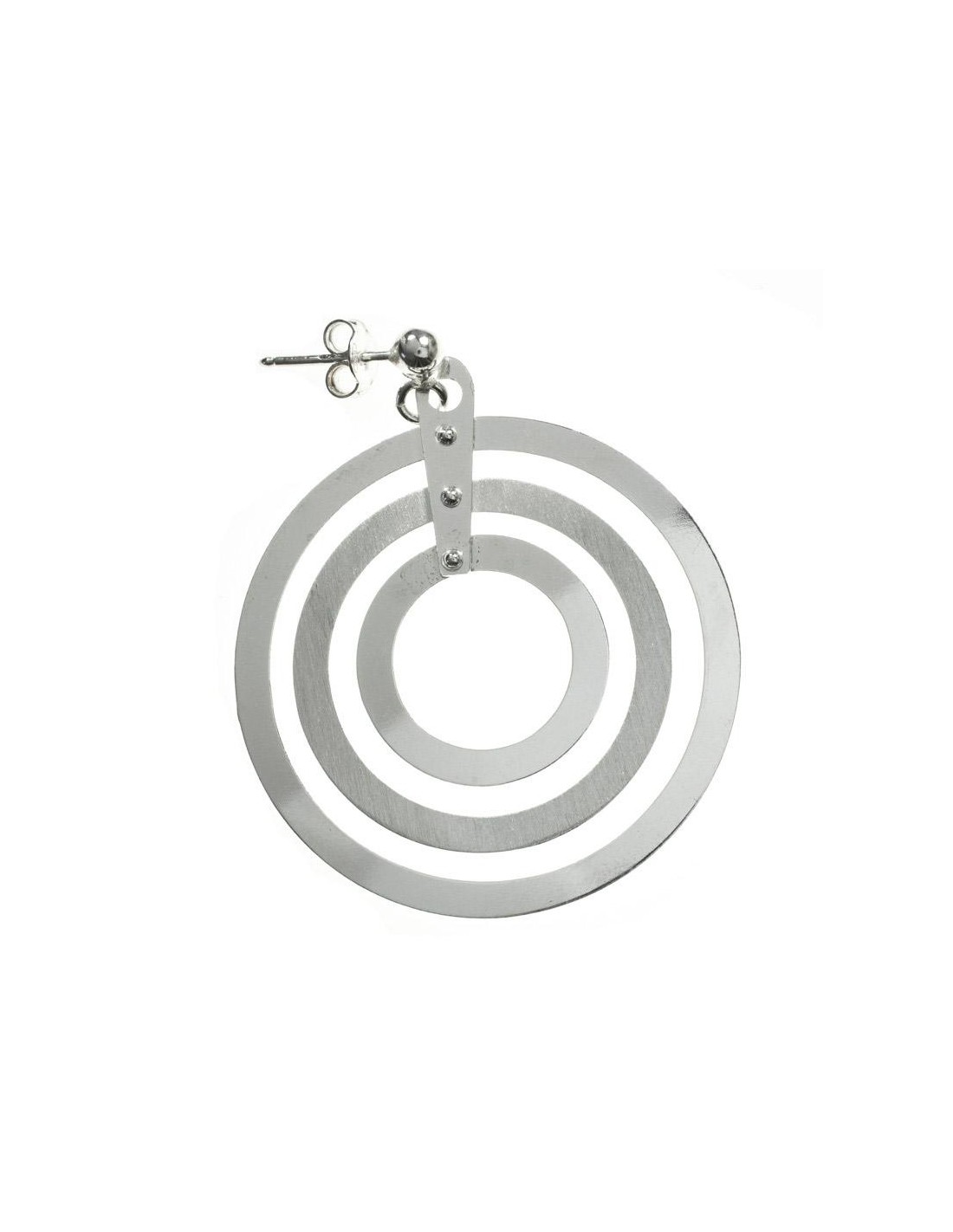 Pendientes geométricos con diseño de triple círculo concéntrico, fabricados en Plata de Ley 925 con acabado liso.