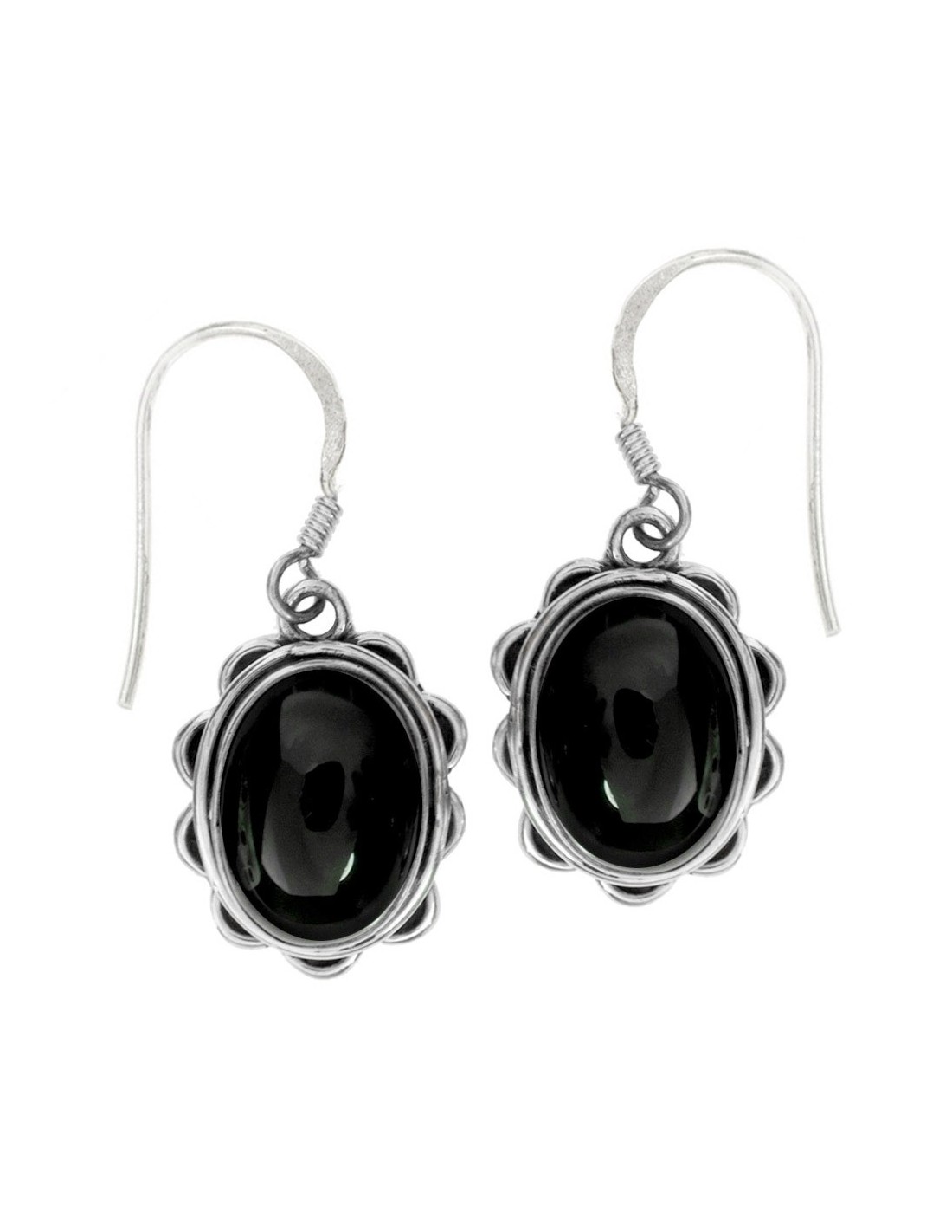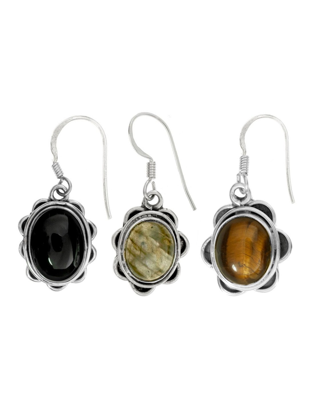 Pendientes largos flor con piedra oval fabricados en Plata de 1ª Ley 925 con gancho hippie.