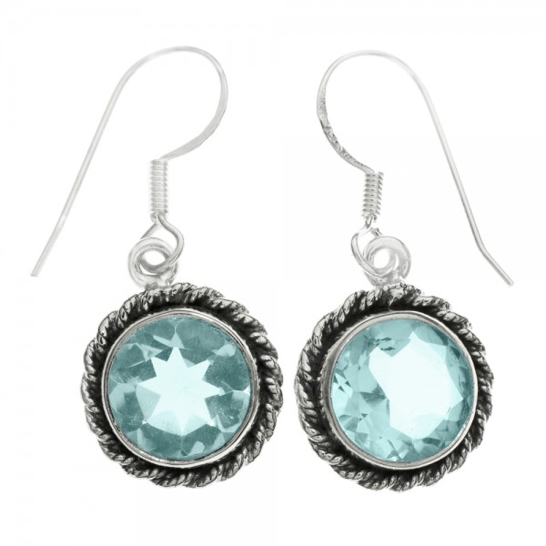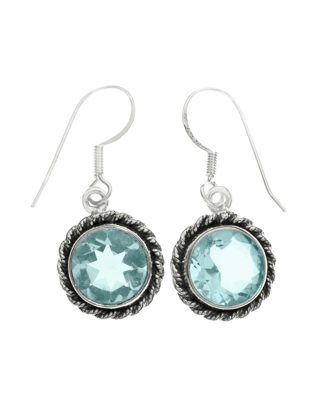 Pendientes largos diseño doble redondo de aguamarina facetada fabricados en Plata de Ley con base diseño cuerda enrollada.