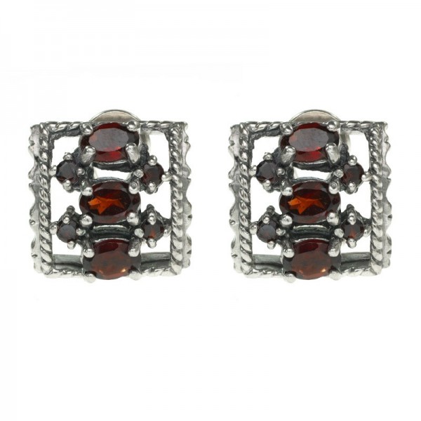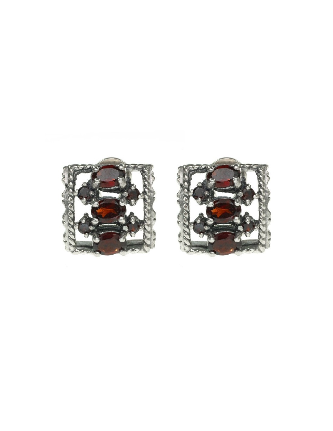 Preciosos pendientes estilo vintage con granates, cierre omega, fabricados en Plata de Ley 925 con acabado envejecido.