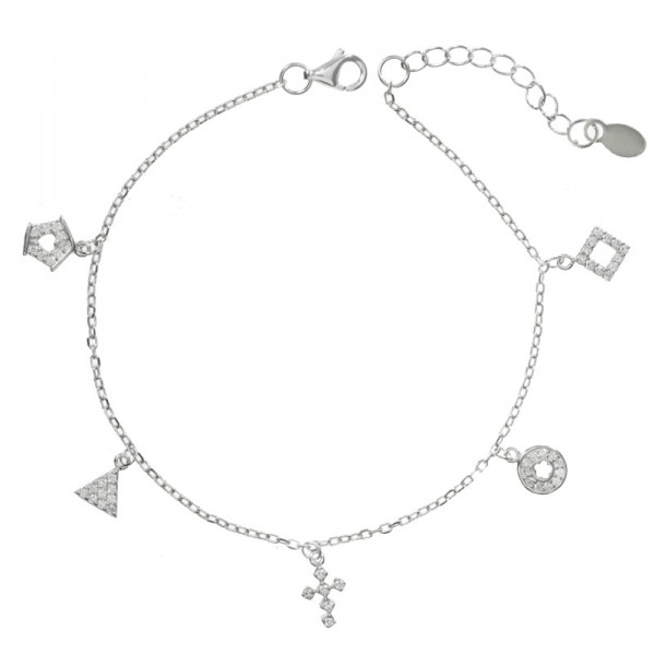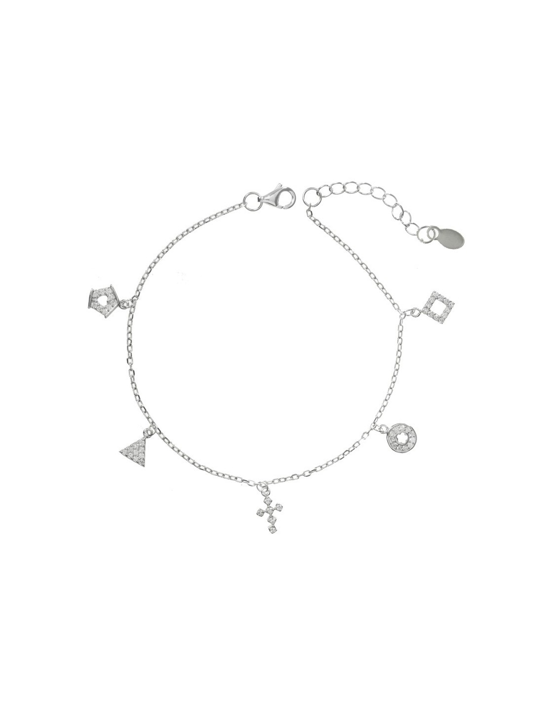 Pulsera ajustable con cinco abalorios colgantes con microcirconitas blancas fabricada en Plata de Ley 925 con baño de rodio. Lleva una casita de pájaro, un triángulo, una cruz, un círculo y un cuadrado.
