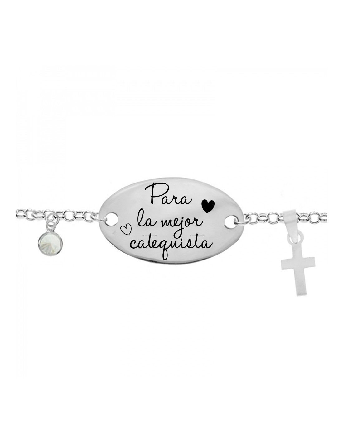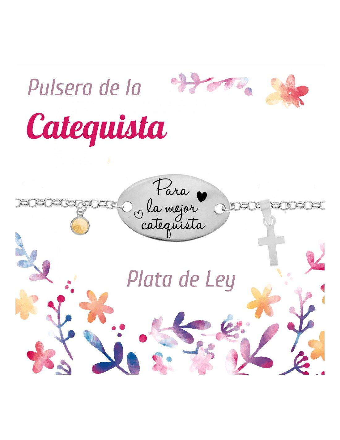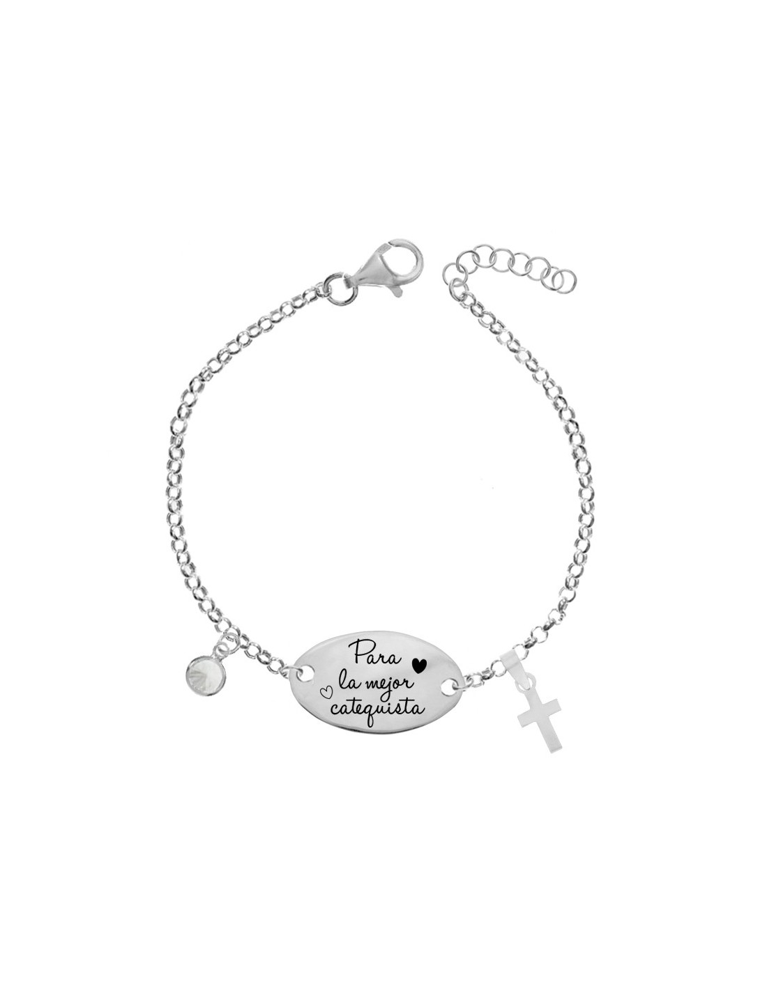 Pulsera de la catequista de Plata de Ley con colgante cruz y punto de luz de color a elegir