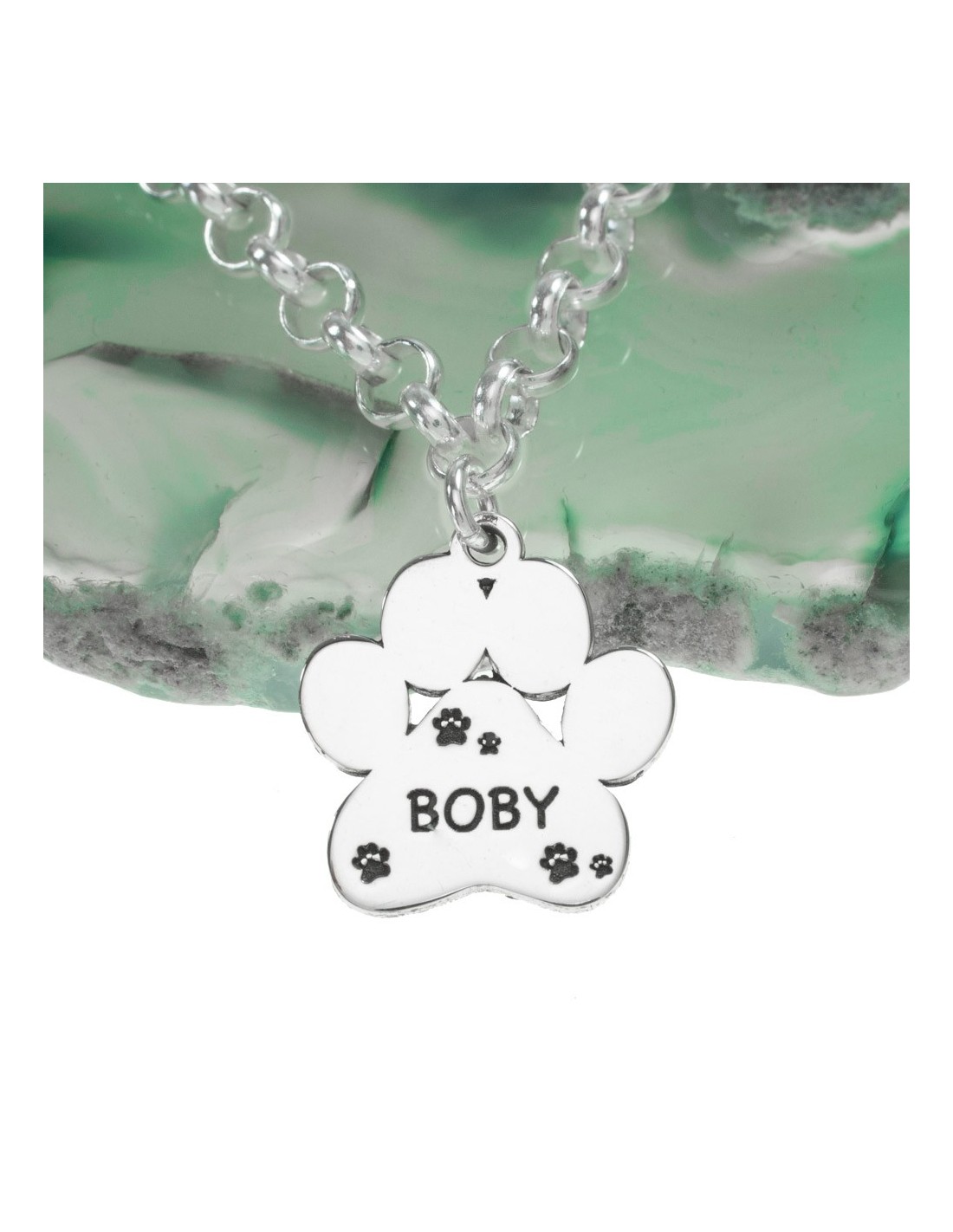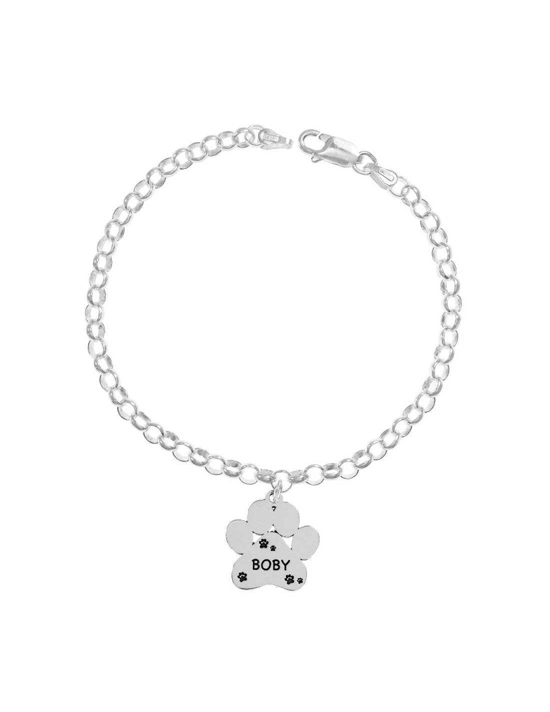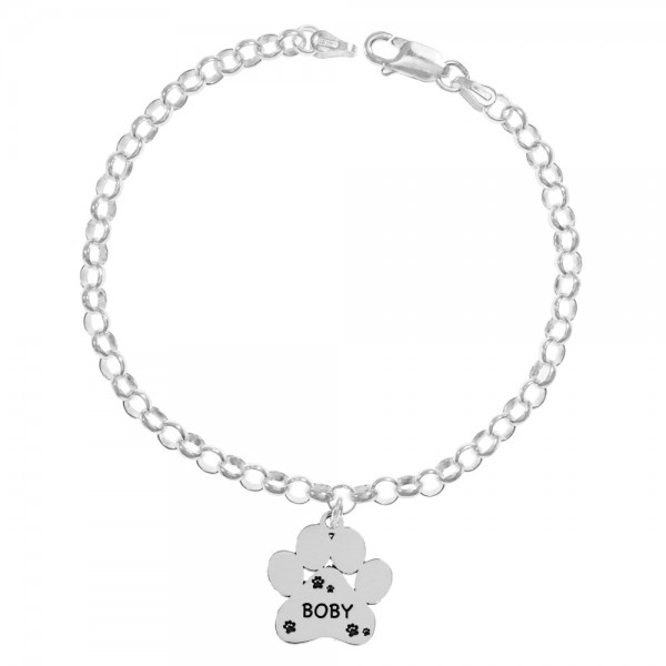 Pulsera con colgante huella de perro con nombre personalizado grabado, hecha en Plata de Ley con corte láser.