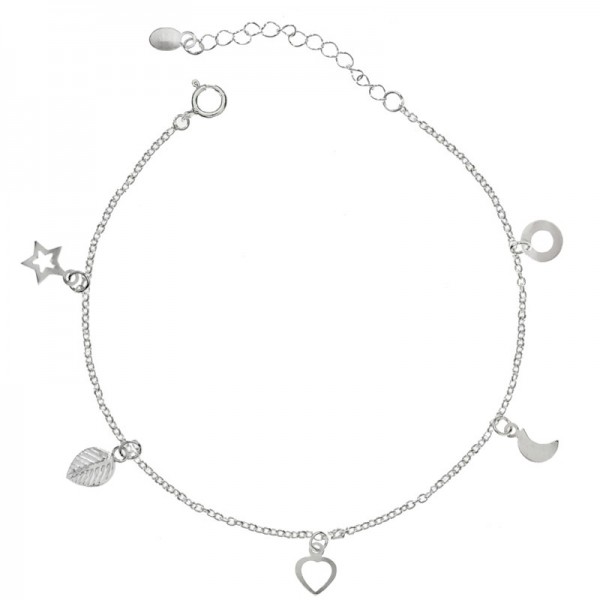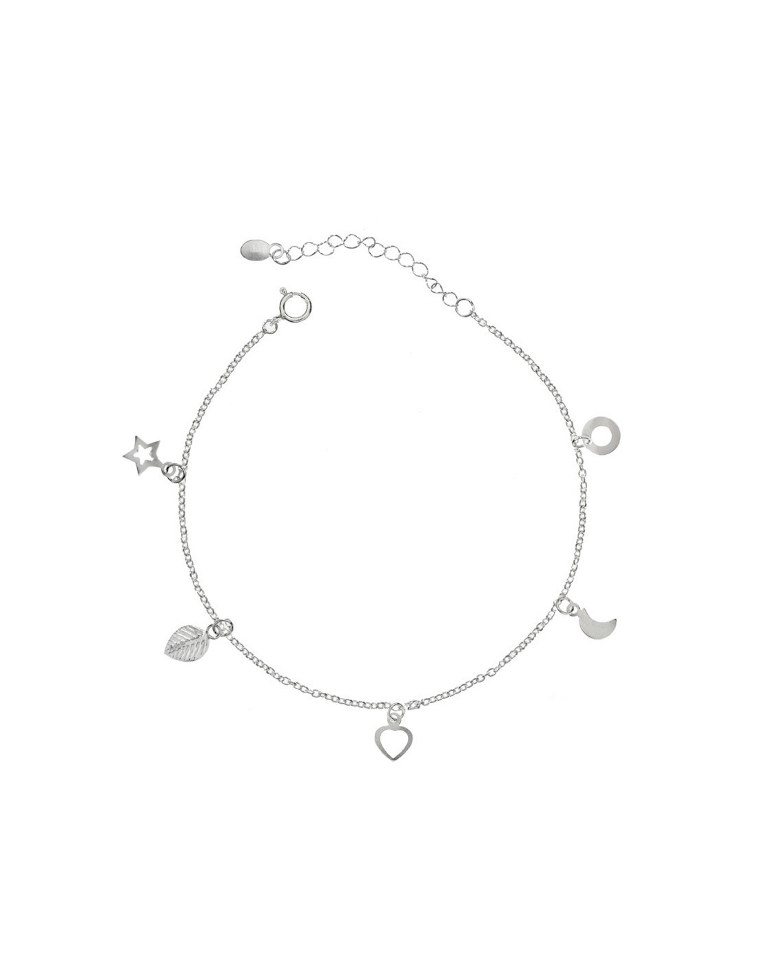 Pulsera con colgantitos fabricada en Plata de Ley: círculo, luna, corazón, hoja y estrella.