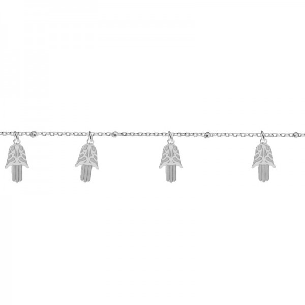 Pulsera ajustable con bolitas intercaladas y abalorios diseño mano de Fátima, fabricada en Plata de Ley 925 con acabado liso.