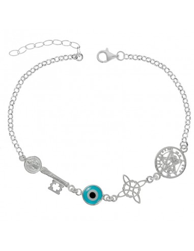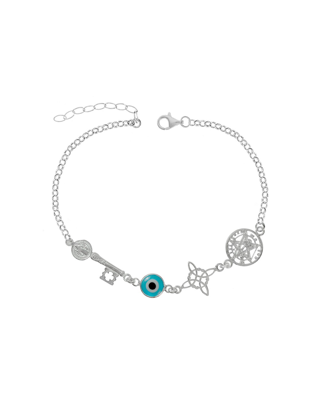 Pulsera cuádruple amuleto de protección y buena Suerte diseñada con llave abre caminos de San Benito. ojo turco, nudo de bruja y tetragrámaton. Fabricada en Plata de Ley.
