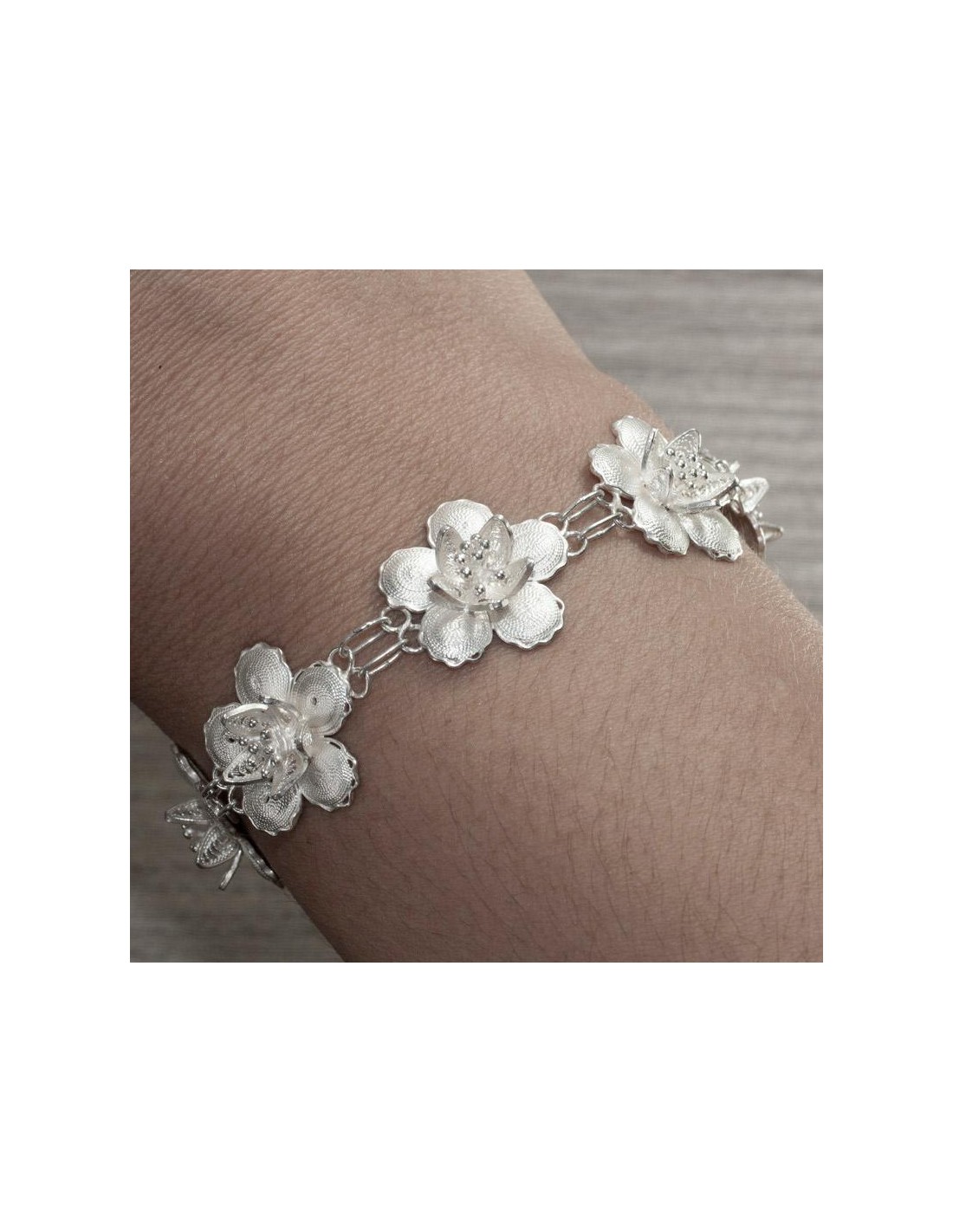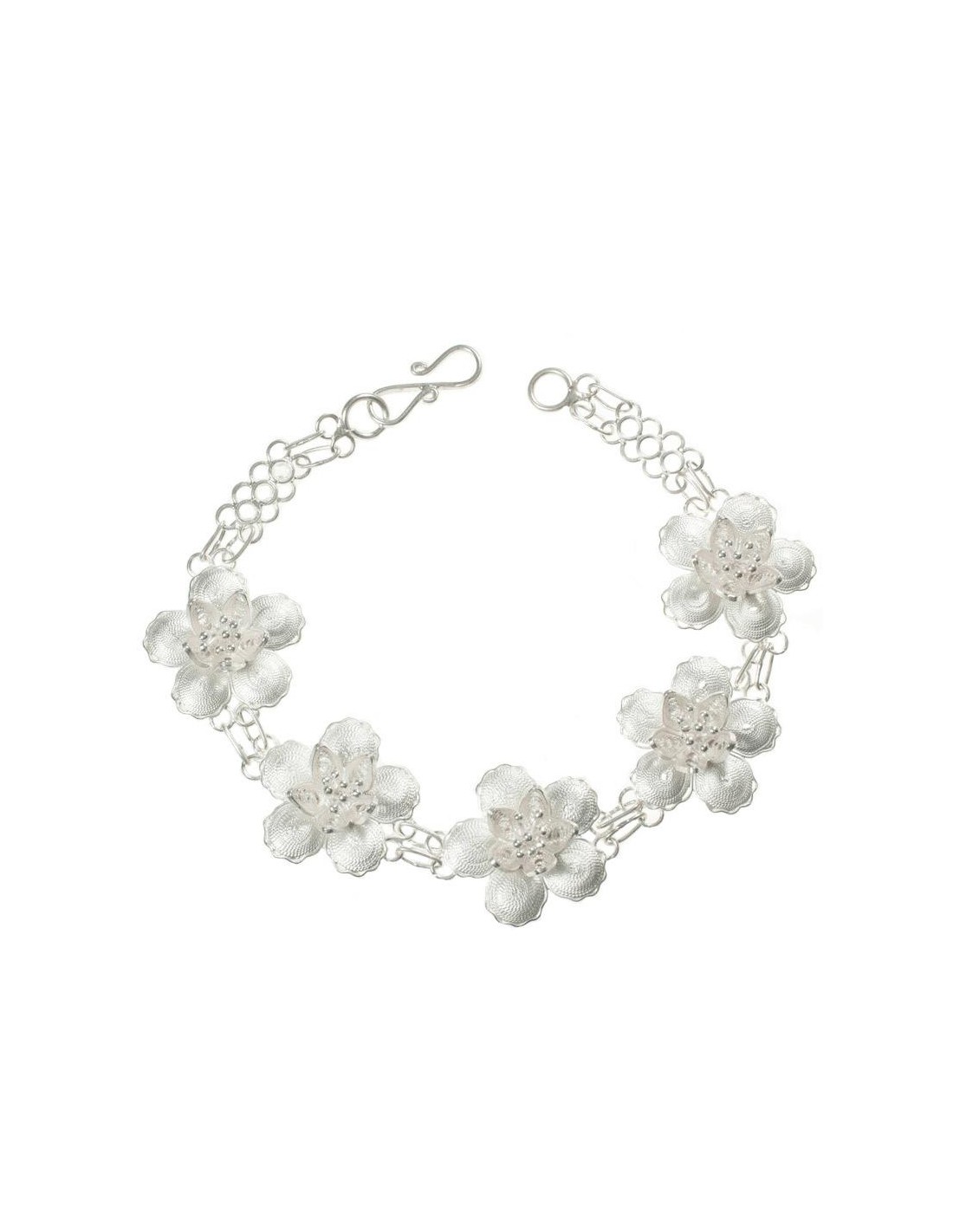 Preciosa pulsera de filigrana con diseño de flores con estambres, fabricada en Plata de Ley 925 con acabado liso.