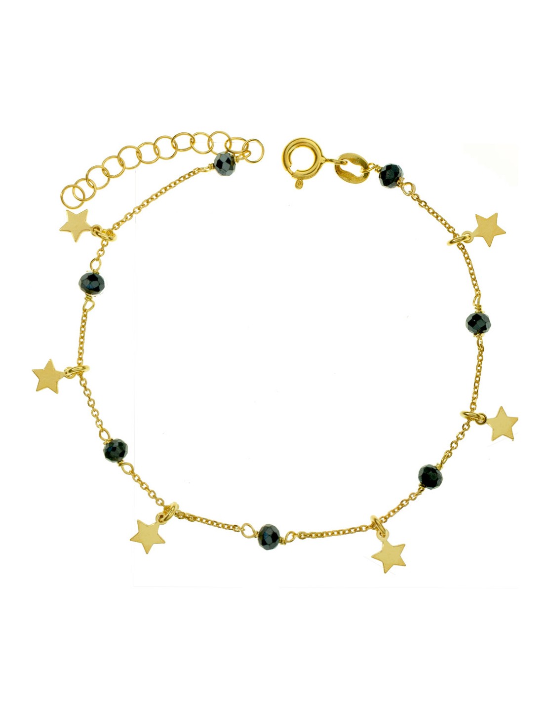 Pulsera dorada con estrellas colgantes y cristales facetados color azul marino fabricada en Plata de Ley.