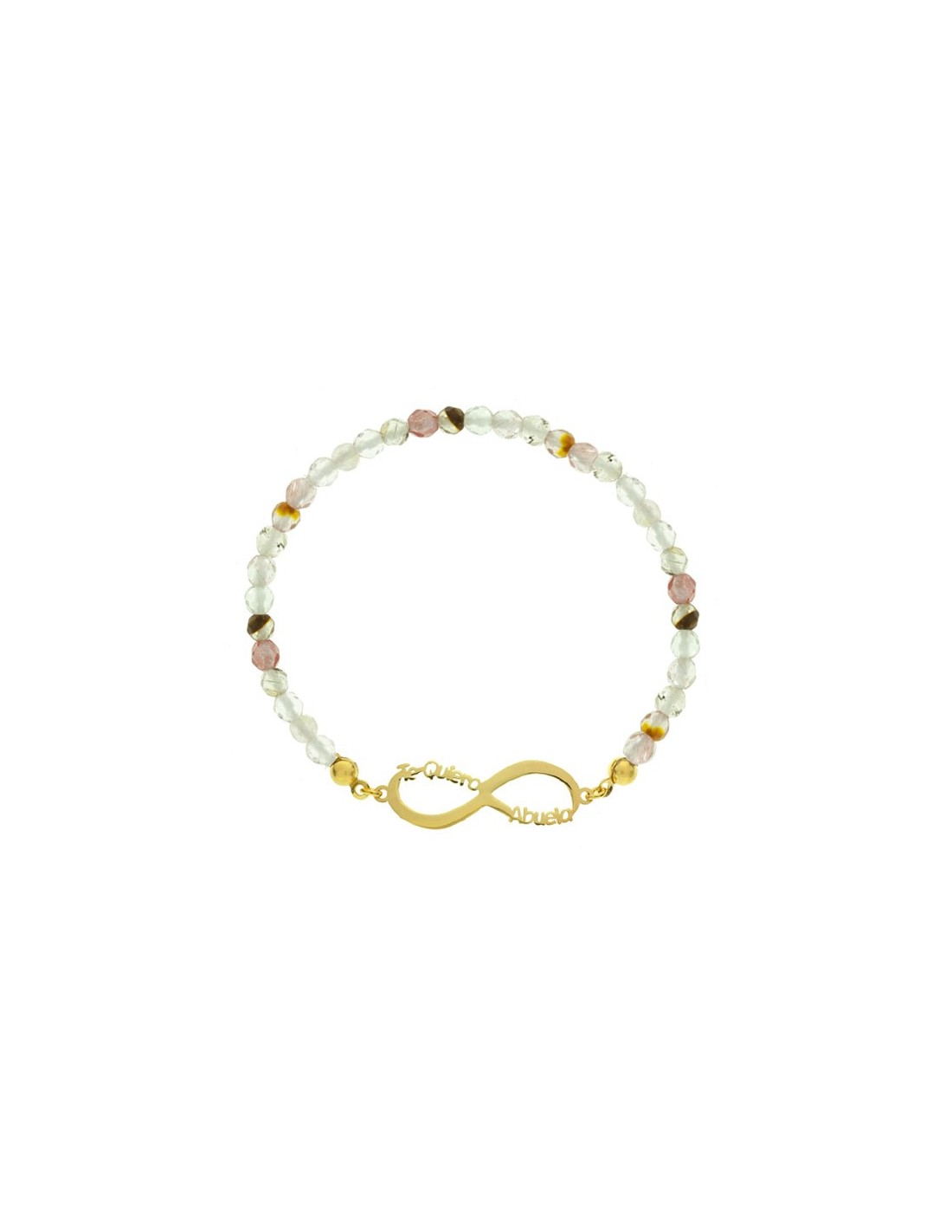 Pulsera elástica de piedras naturales con entrepieza dorada diseño infinito Te Quiero Abuela fabricada en Plata de Ley bañada en Oro.