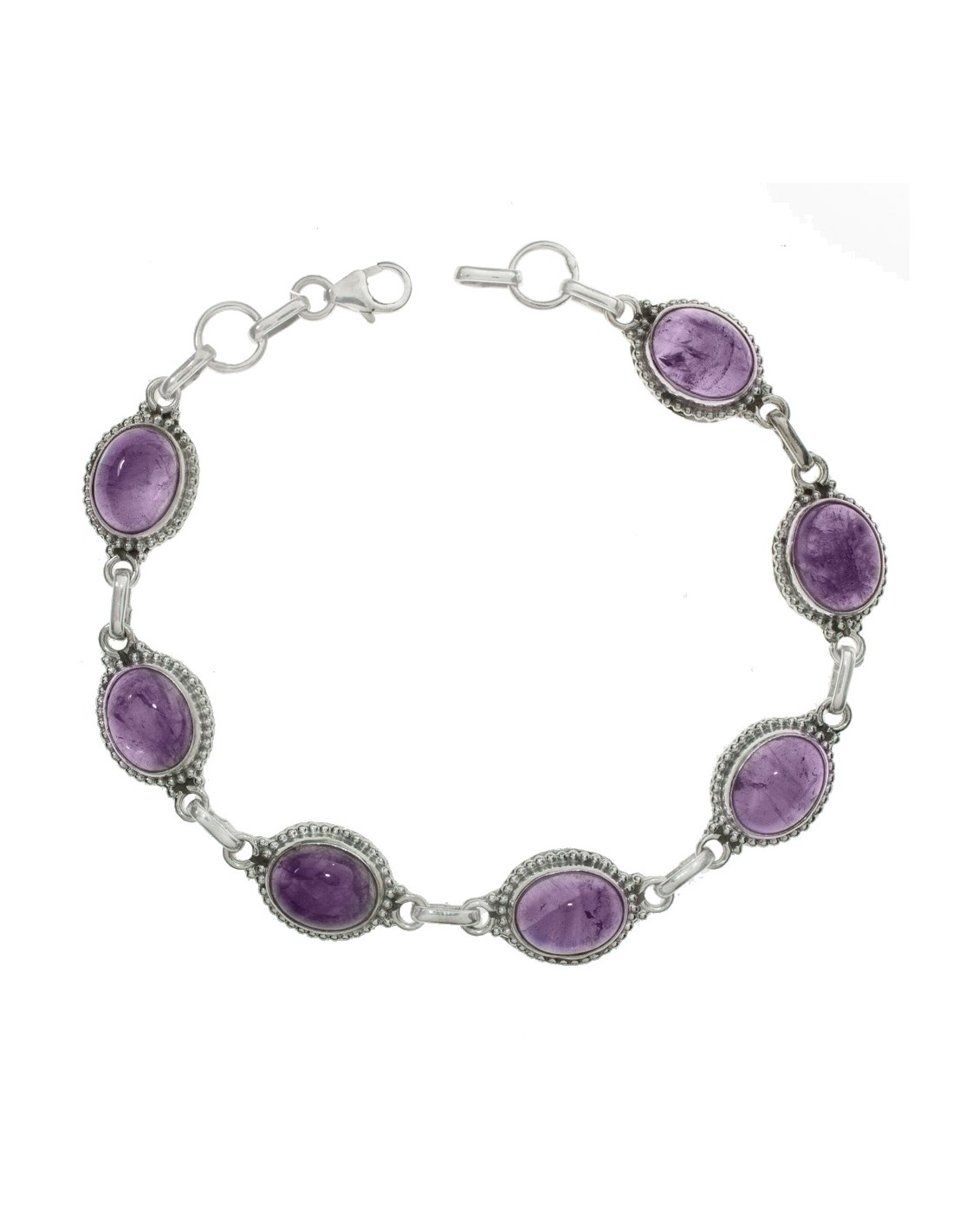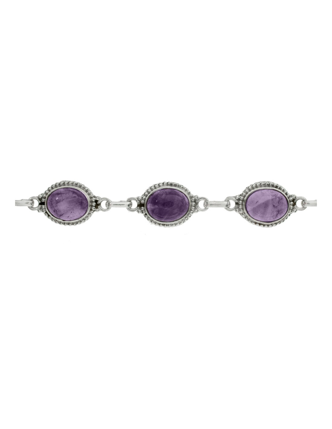 Pulsera étnica con eslabón ovalado de piedra amatista fabricada en Plata de Ley.