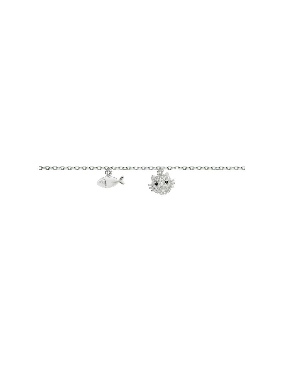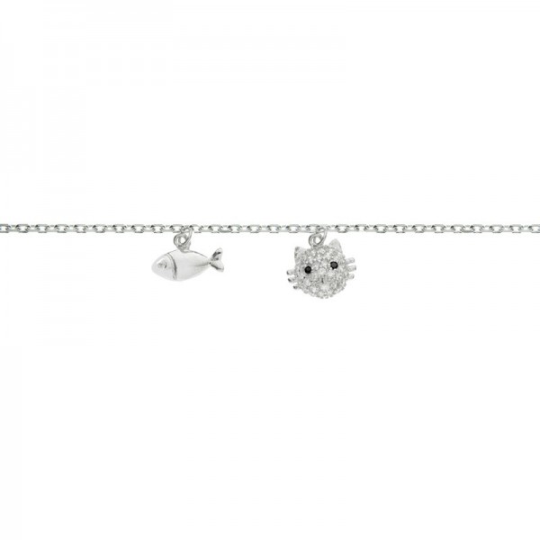 Pulsera ajustable con dos abalorios colgantes diseño gato y pez fabricada en Plata de Ley 925 con baño de rodio