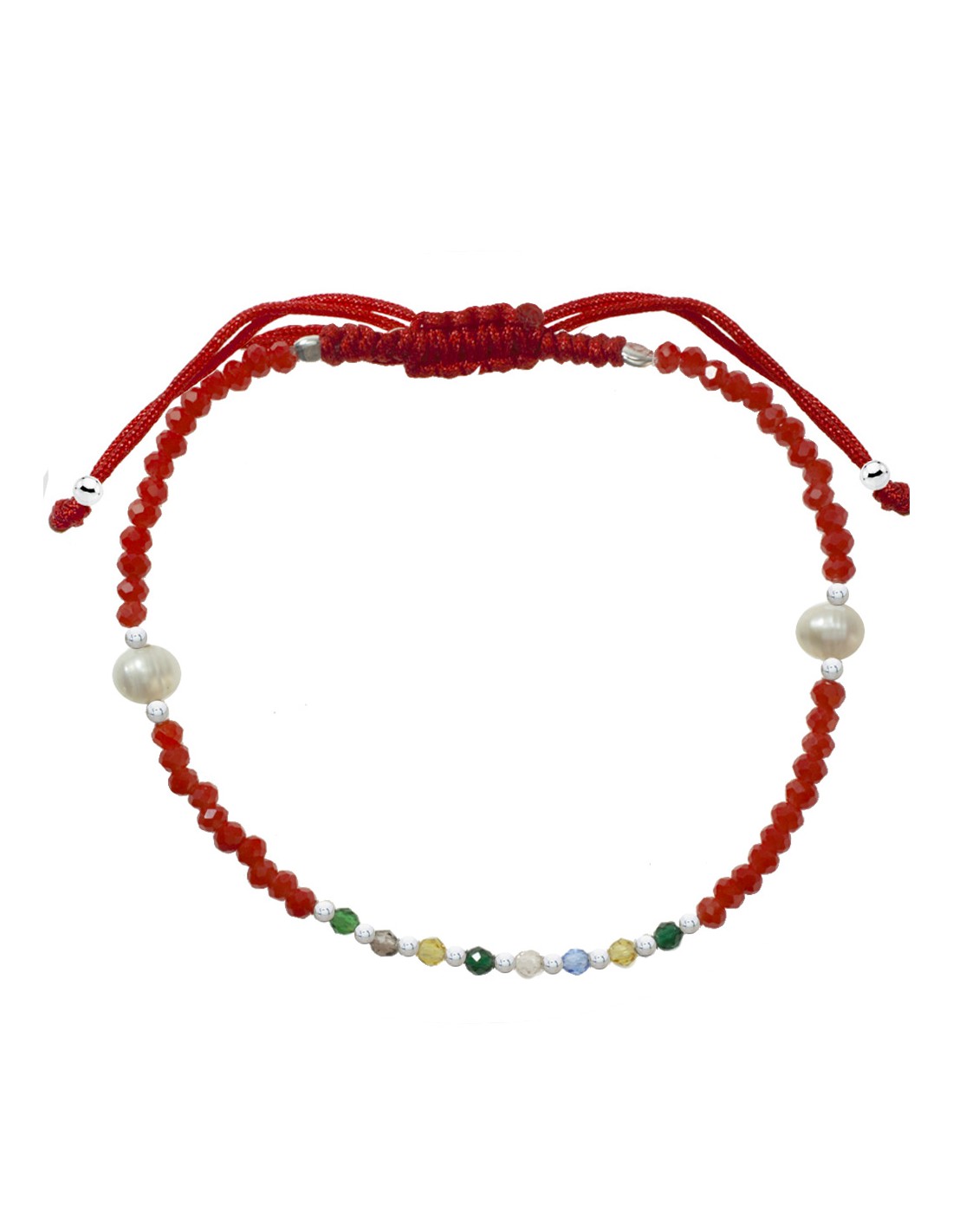 Pulsera macramé con Perla Natural, cristales de colores y rojos Plata de Ley