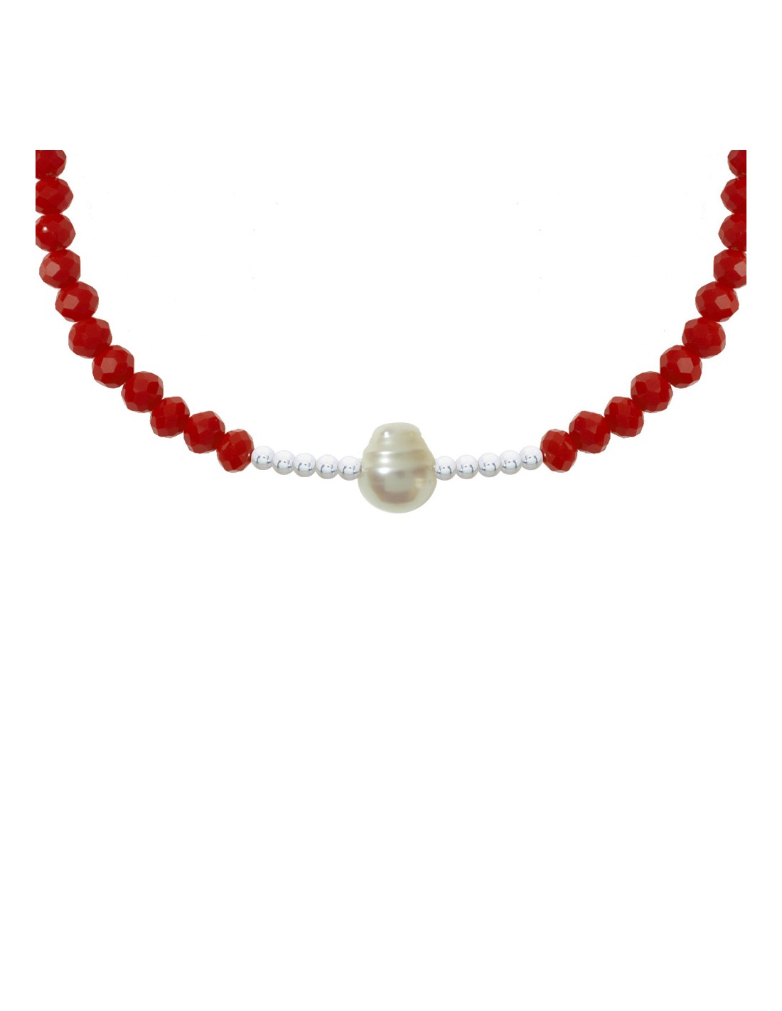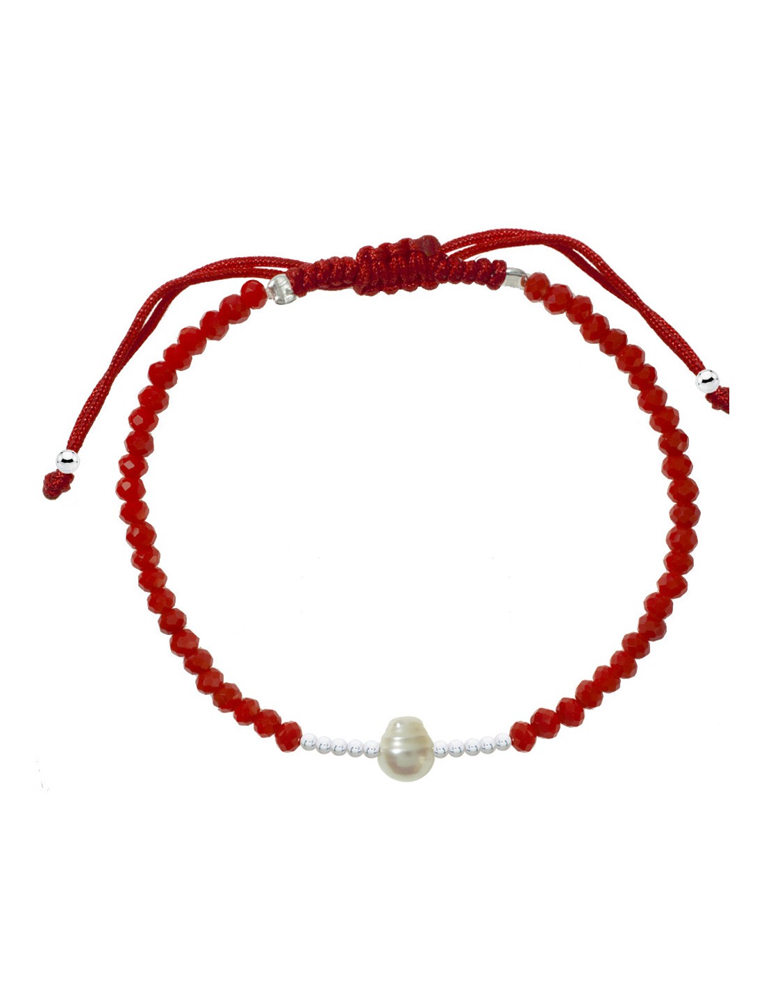 Pulsera macramé con Perla Natural y cristales rojos Plata de Ley