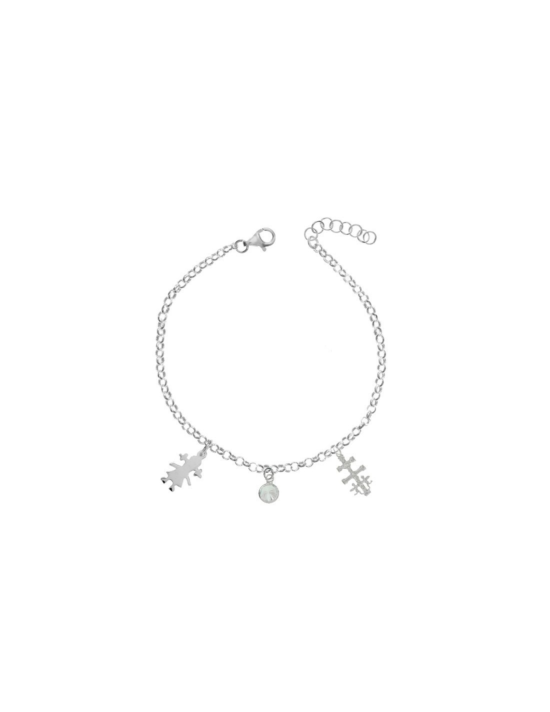 Pulsera para niña con colgantes niña, punto de luz de circonita blanca y cruz de caravaca fabricada en Plata de Ley 925.