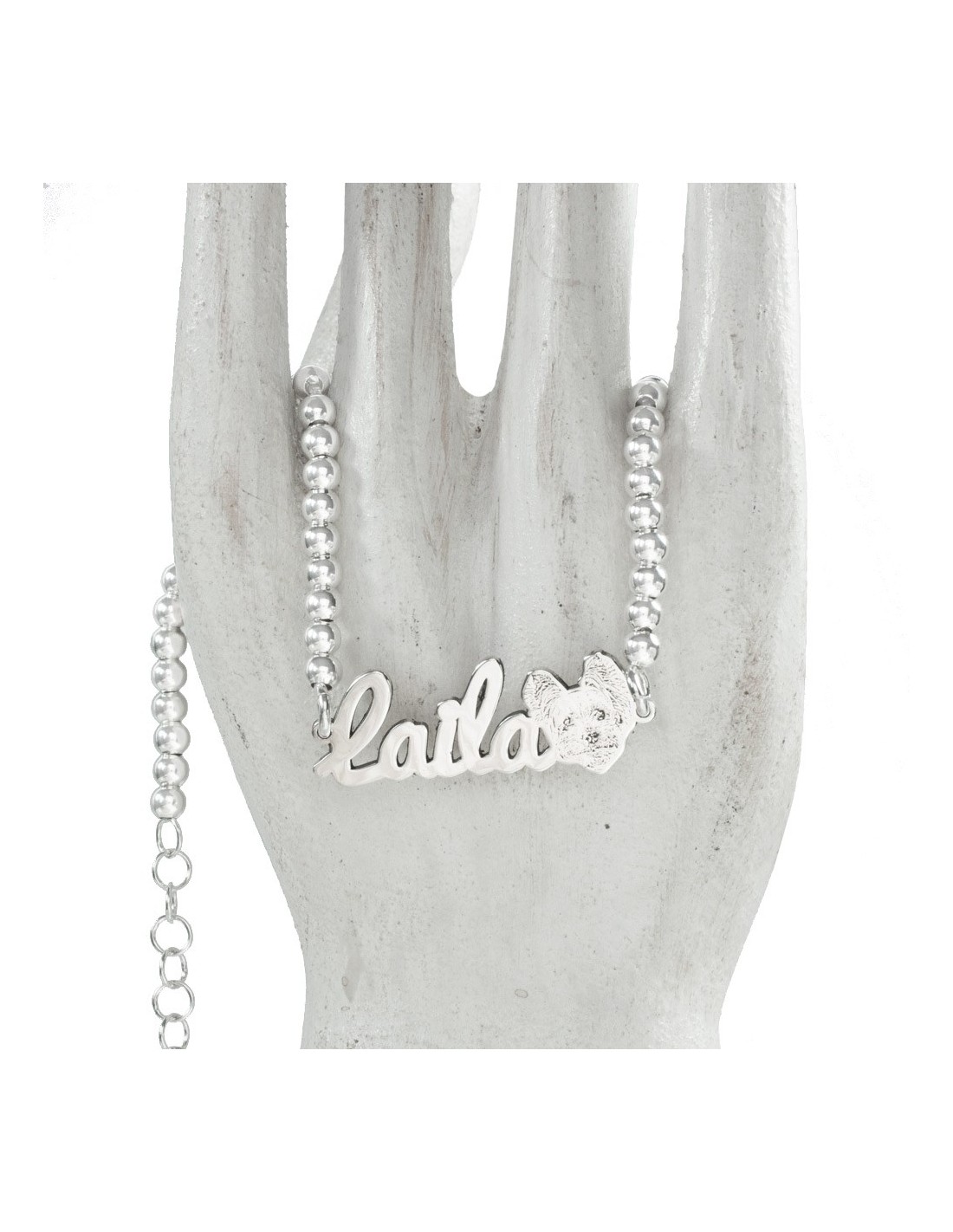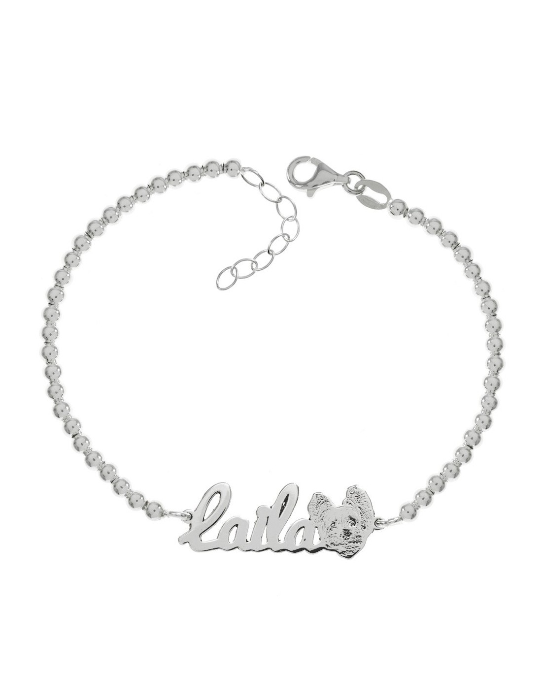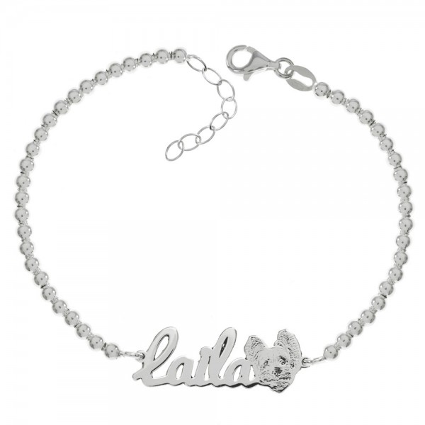 Pulsera ajustable de bolitas con perro y nombre personalizado, hecha en Plata de Ley con corte láser.